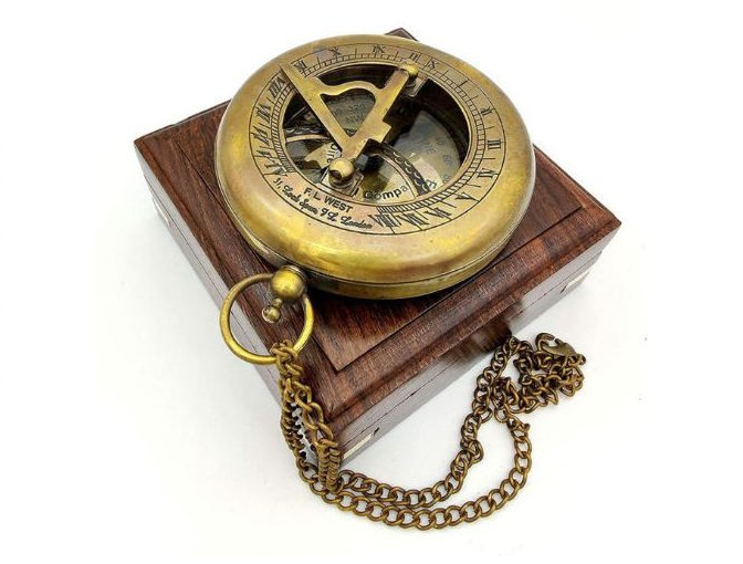 เข็มทิศกระเป๋าทองเหลืองโบราณพร้อมสลักนาฬิกาแดดพิมพ์ลายตกแต่งทางทะเลที่กำหนดเองเพื่อยกระดับคอลเลกชันของคุณ