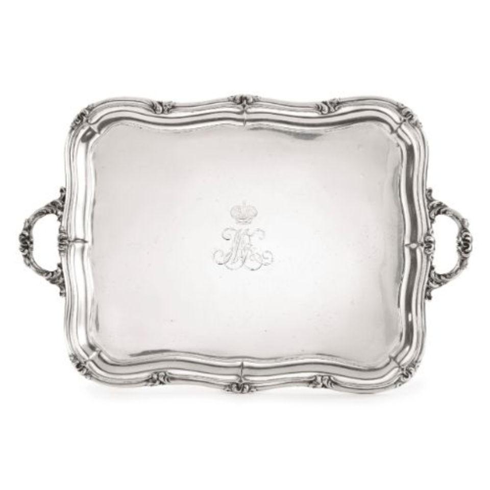 ถาดเสิร์ฟทรงสี่เหลี่ยมผืนผ้าสไตล์โบราณสีเงิน พร้อมขอบลายนูนอย่างประณีตและหูจับสองข้าง สำหรับโรงแรมและร้านอาหารที่บ้าน