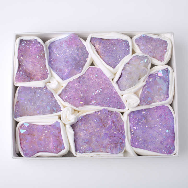 ชุดอัญมณีดิบคลัสเตอร์คริสตัลออร่าสีม่วงพร้อมกล่องหินบำบัดขัดเงาตามหลักฮวงจุ้ย