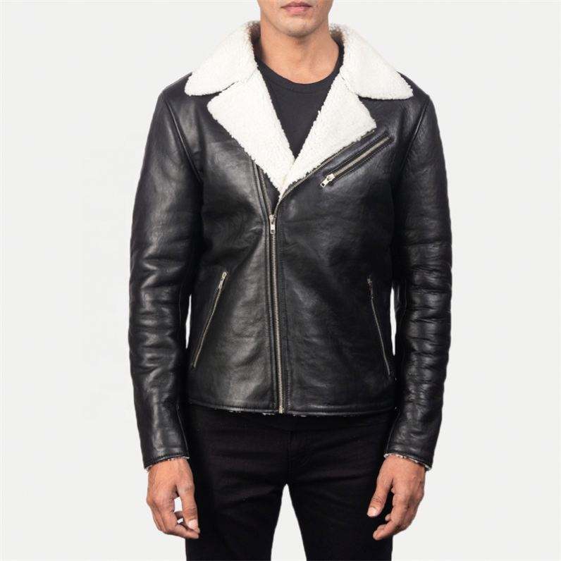 Product Name:Winter Biker White Shearling Black Leather Coat Motorcycle Mens Jacket