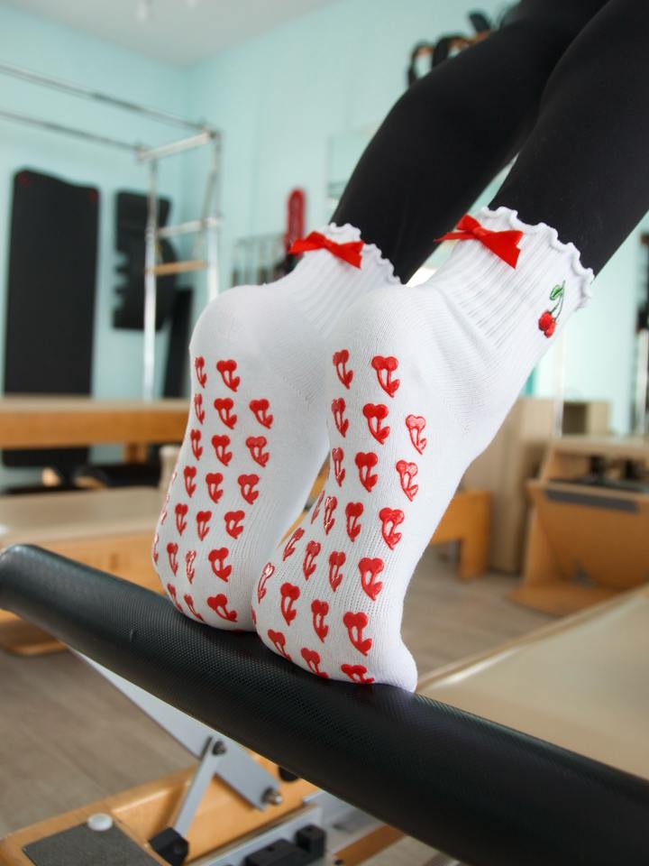 ถุงเท้าพิลาทิส BCSI แบบขายส่ง ลายเชอร์รี่และโบว์ พร้อมโลโก้และบรรจุภัณฑ์แบบกำหนดเอง ป้องกันการลื่น สำหรับออกกำลังกาย โยคะ และบาร์เร่