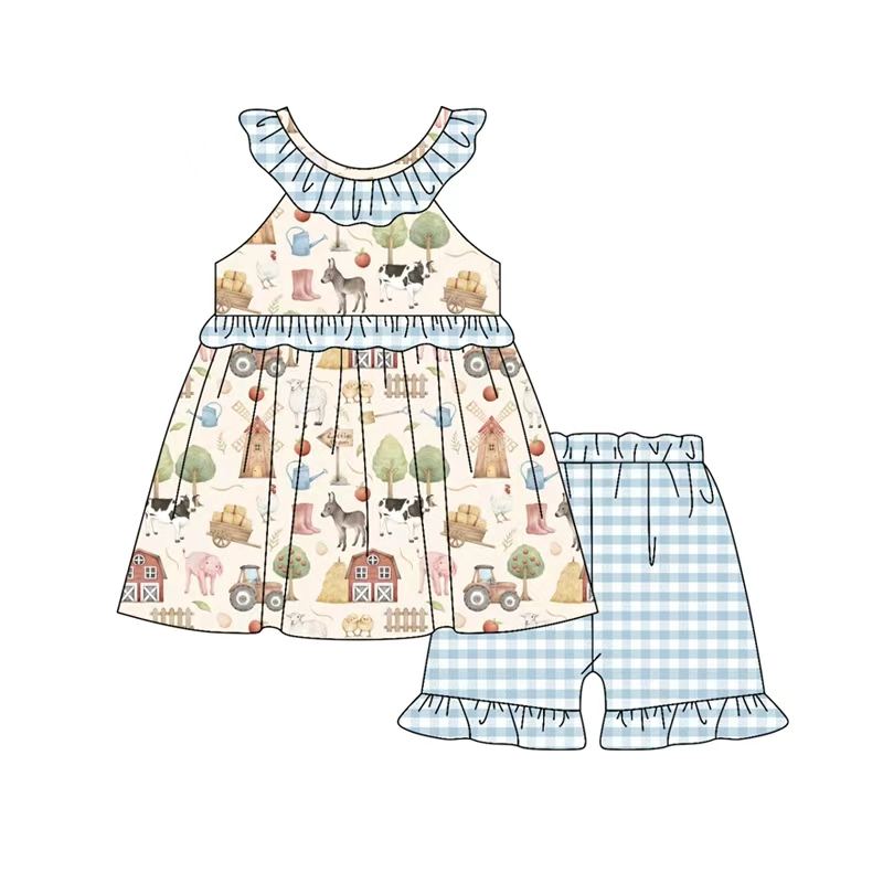 ชุดเสื้อกล้ามลายดอกไม้สีฟ้าลำลองคุณภาพสูงพร้อมกางเกงขาสั้นระบายสำหรับเด็กผู้หญิง ขายส่ง พร้อมส่ง ผลิตจากโพลีเอสเตอร์