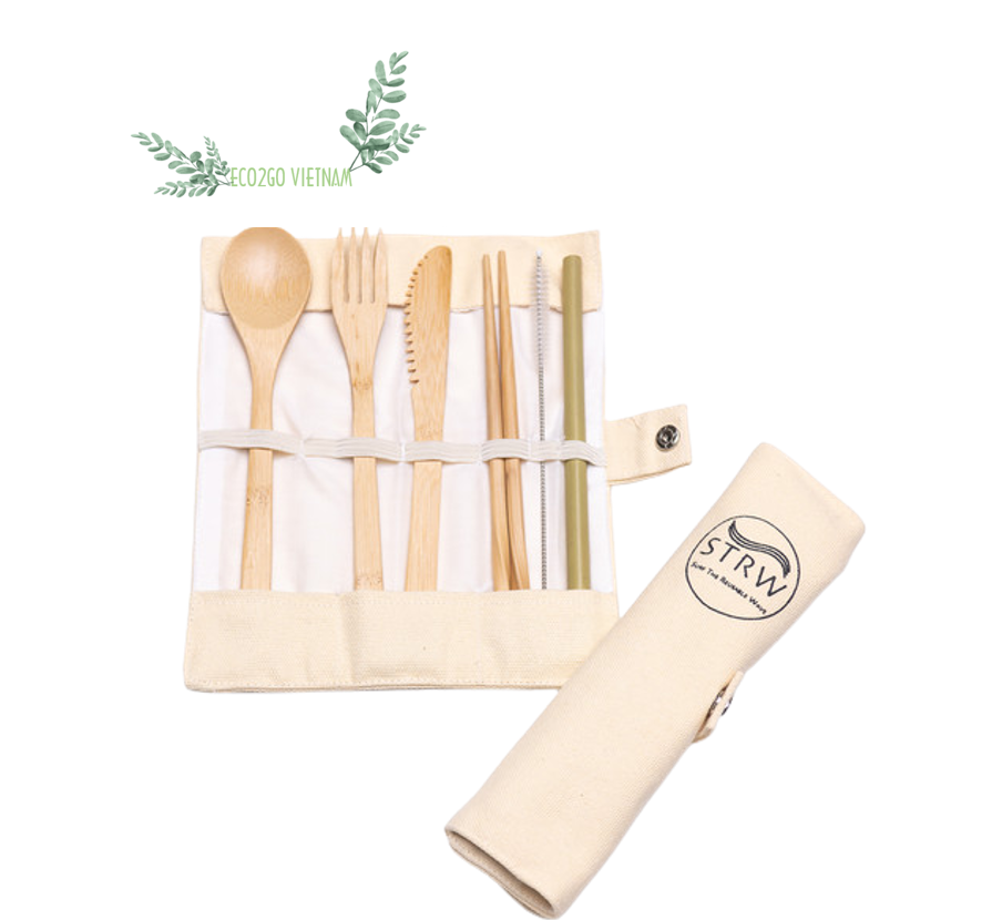 ชุดช้อนส้อมไม้ไผ่แบบพกพาชุดช้อนส้อมพร้อมถุงใส่โลโก้เลเซอร์โดย Eco2go ประเทศเวียดนาม