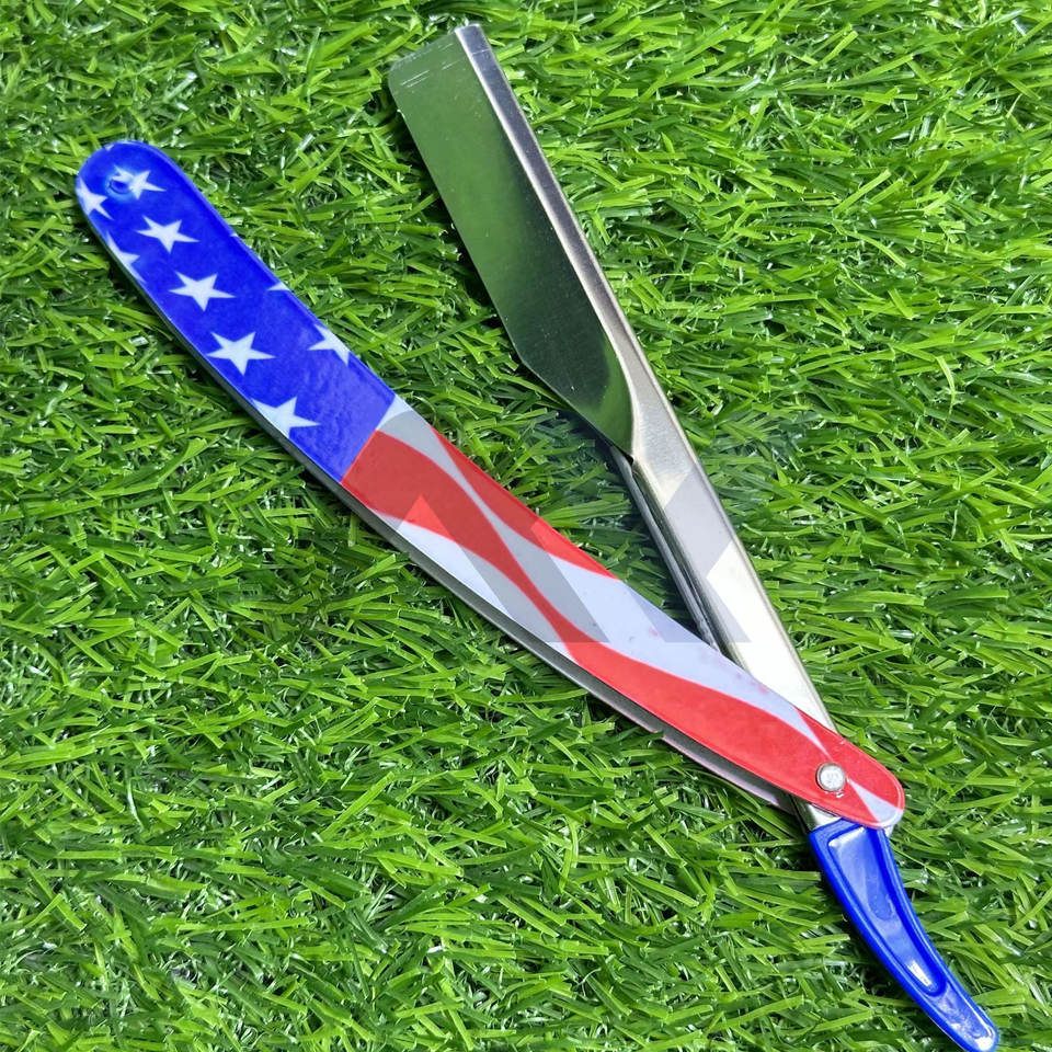 มีดโกนหนวดขายส่งแบบ OEM สำหรับผู้ชาย แบบพับได้ พิมพ์ลายธงชาติอเมริกา พร้อมตัวล็อคแบบเลื่อน อุปกรณ์โกนหนวดสำหรับร้านตัดผม