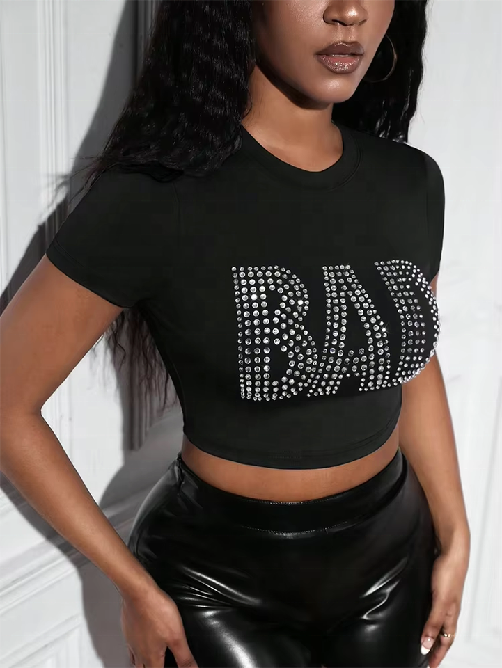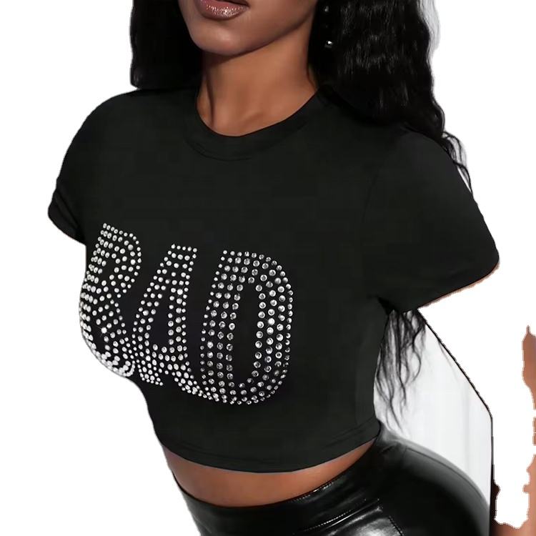 เสื้อครอปท็อปแฟชั่นฤดูร้อนสำหรับผู้หญิงขายส่ง พร้อมโลโก้ประดับเพชร คอกลม เสื้อยืดครอปท็อปผู้หญิง เสื้อยืดคริสตัล