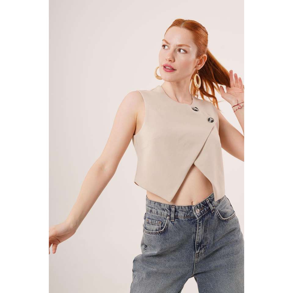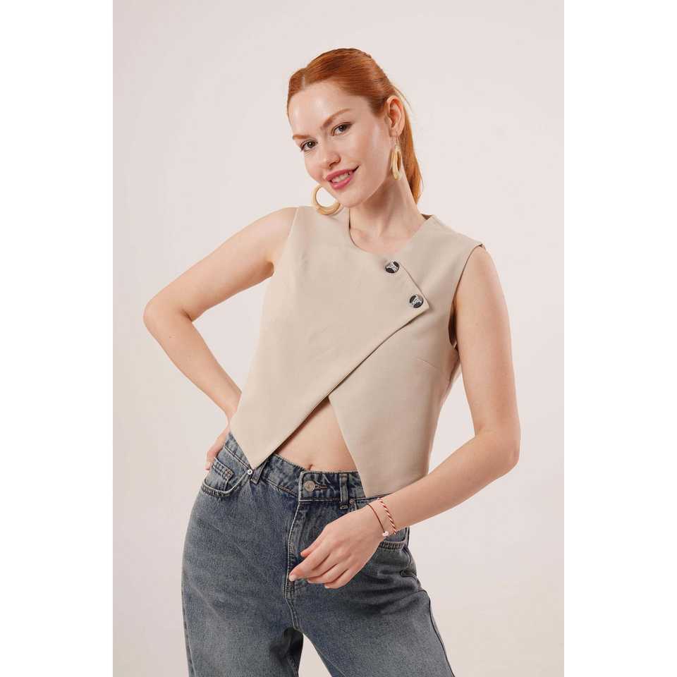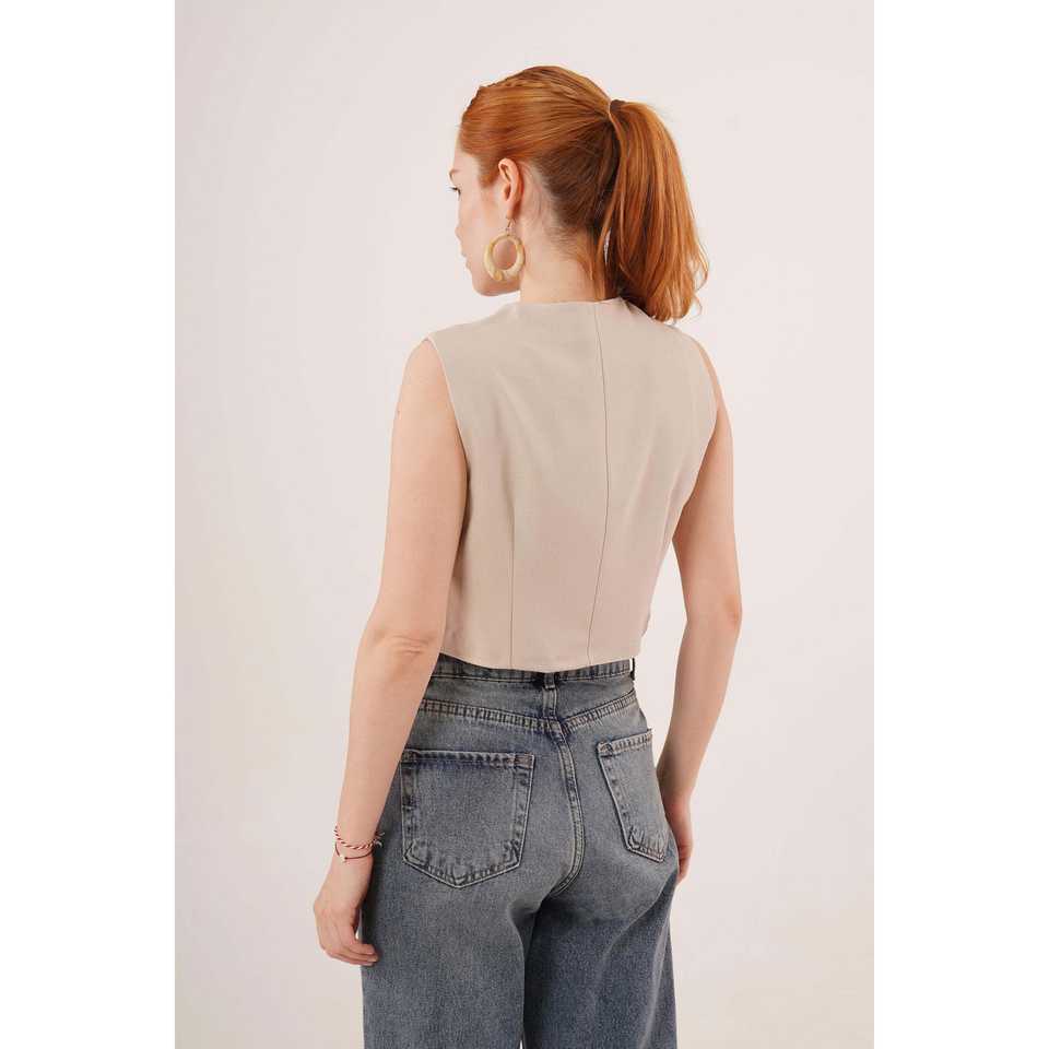 เสื้อกั๊กผู้หญิงแบบมีกระดุมสองแถว สีเบจ ขายส่ง สไตล์ลำลอง ปักโลโก้ กันลม ผ้าทอขนสัตว์ผสมผ้าแคนวาส