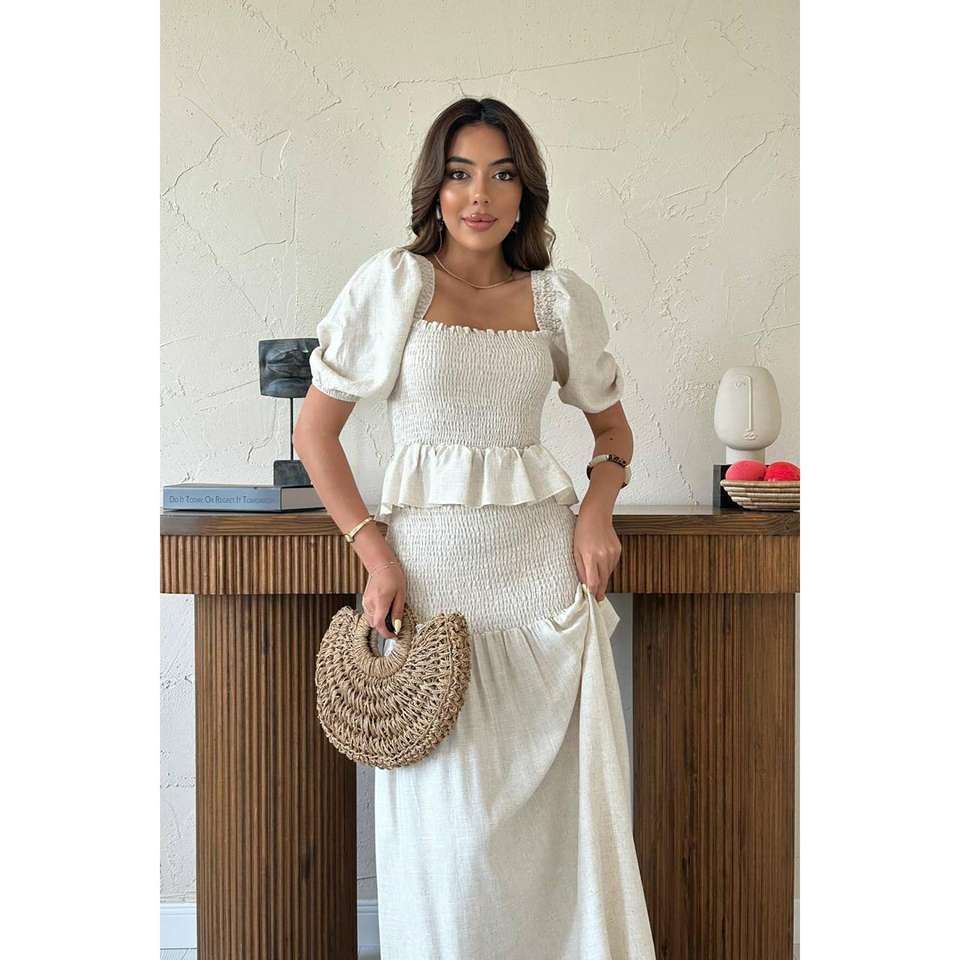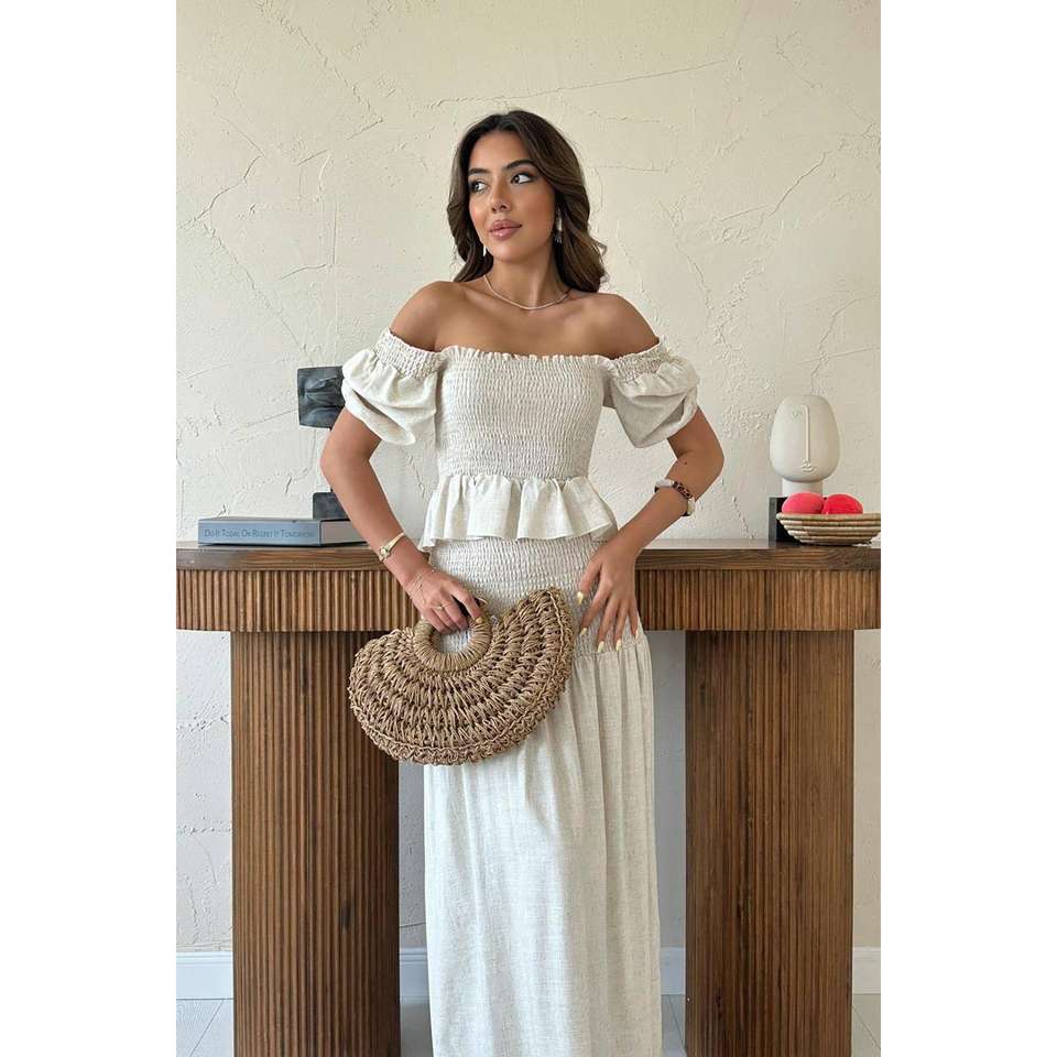 ชุดเซ็ตผ้าลินินสีเบจ Gipeli สำหรับผู้หญิง แขนสั้น สไตล์ Prairie Chic ระบายอากาศได้ดี ชุดเดรสสองชิ้น ขายส่ง