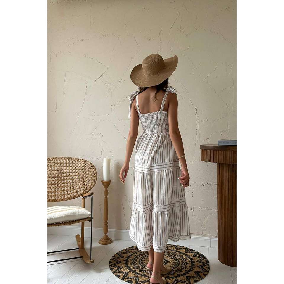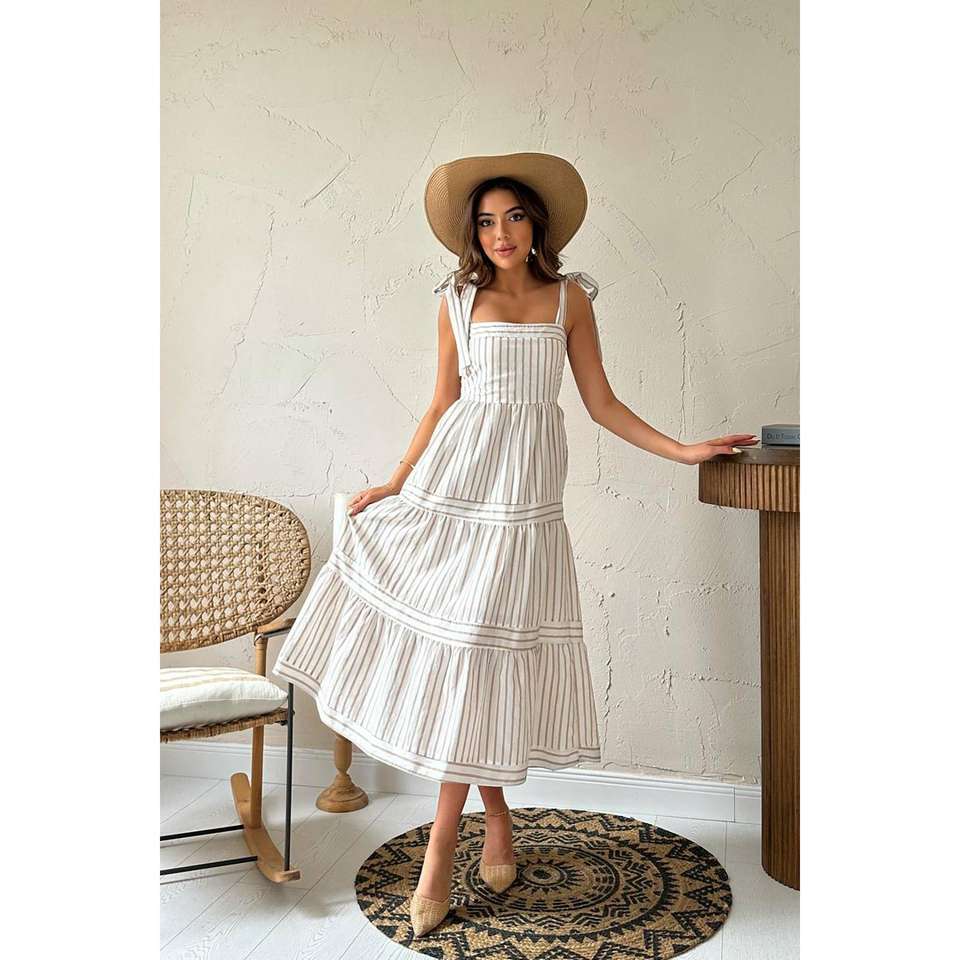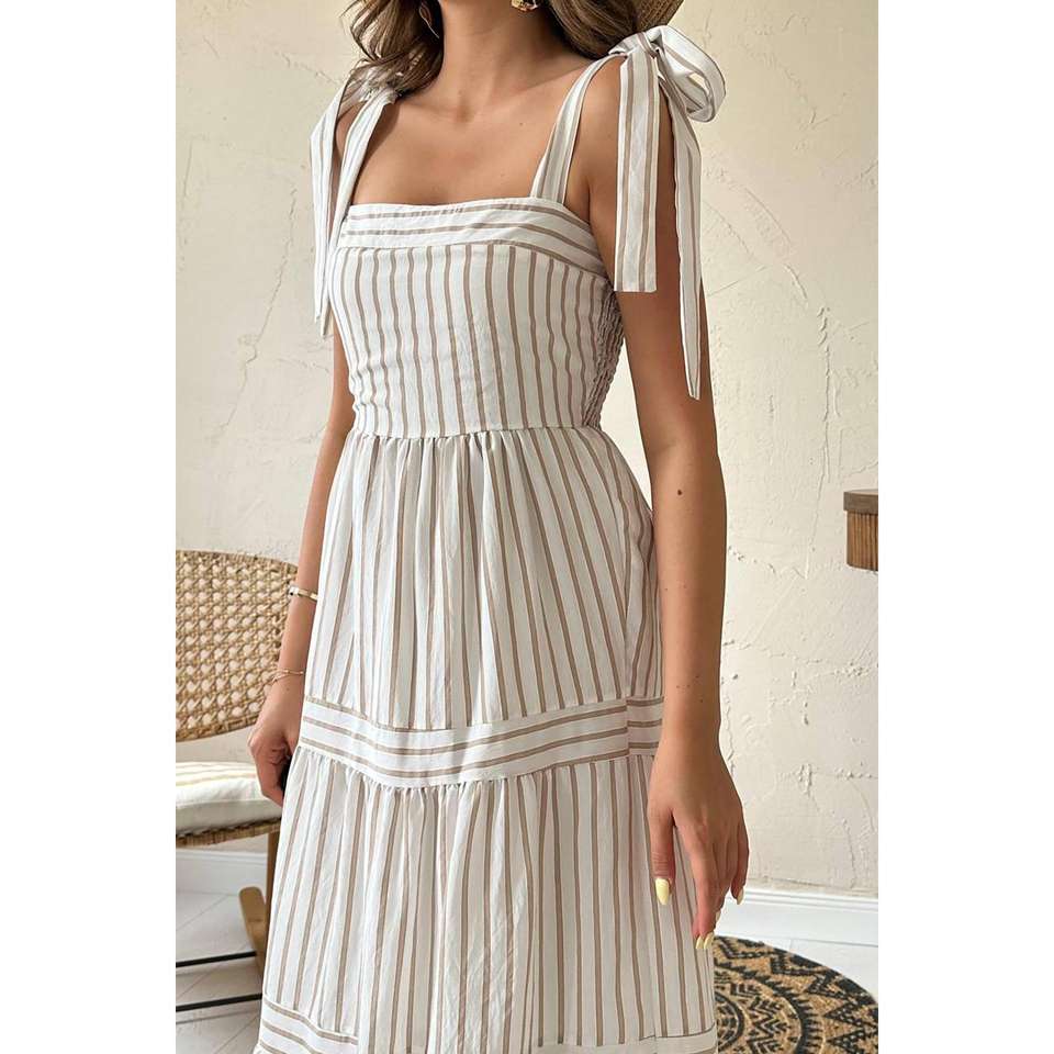 เดรสลายทางสีเบจแบบขายส่ง ทรงเปิดไหล่ เอวสม็อค ทรงเอไลน์ ผ้าทอระบายอากาศได้ดี สไตล์ลำลอง