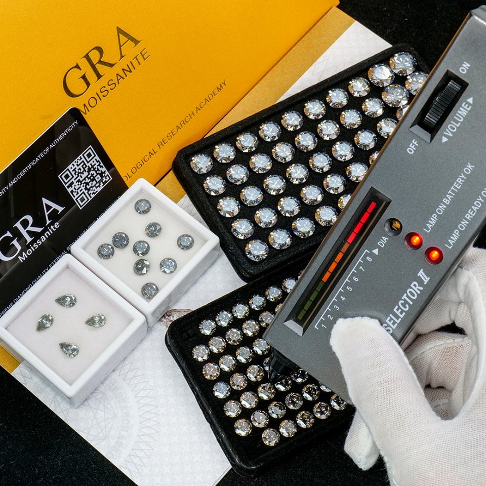 ขายส่งพลอยคุณภาพดีที่สุด ขนาด 3-14 มม. ทรงหยดน้ำ ทรงกลม เกรด VVS คุณภาพเยี่ยม โมอิสซาไนต์สีเทาเข้ม พร้อมใบรับรอง