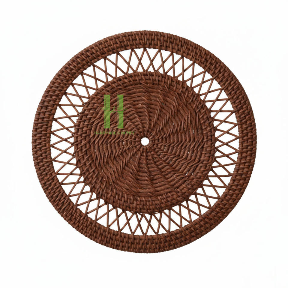 แผ่นรองจานหวายราคาส่งที่ดีที่สุด แผ่นรองจานหวายรูปดอกไม้ ของตกแต่งผนังแบบโบโฮ แผ่นรองจานหวายแบบแขวน OEM