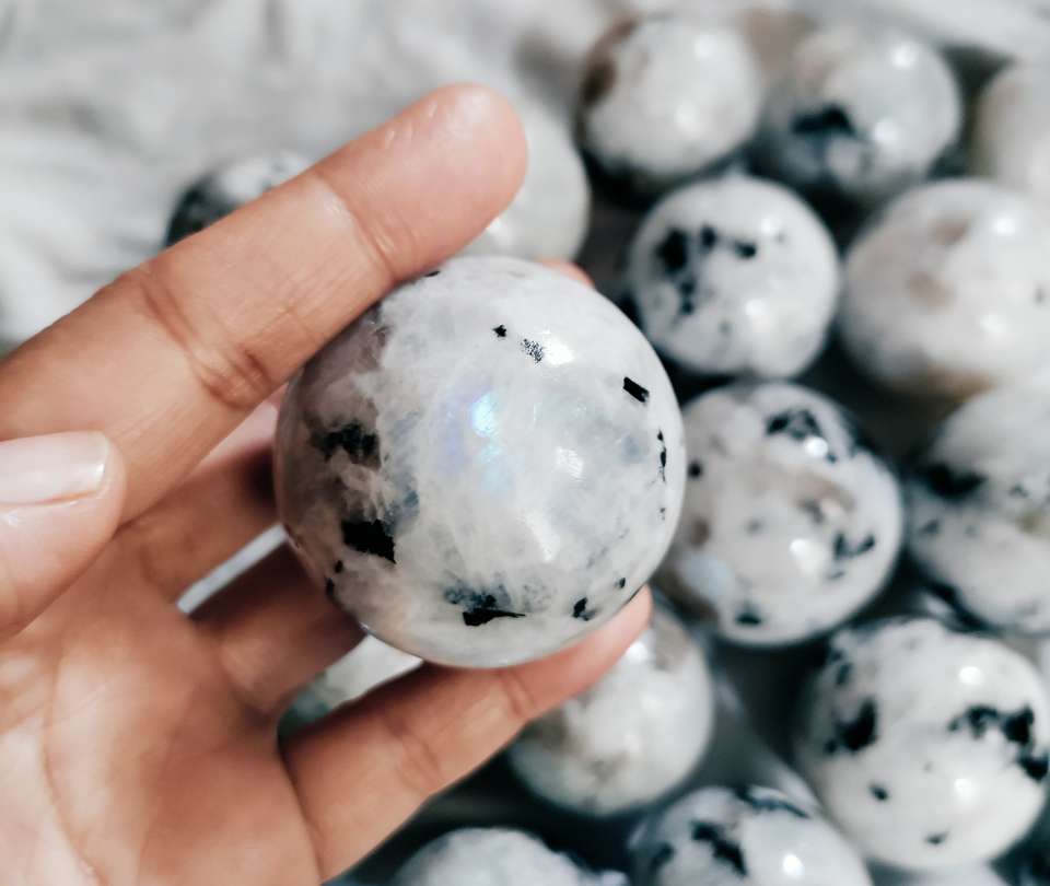 ลูกบอลคริสตัลมูนสโตนสีรุ้งธรรมชาติคุณภาพดีที่สุดสำหรับขายส่ง หินบำบัด สำหรับการทำสมาธิและตกแต่งบ้าน