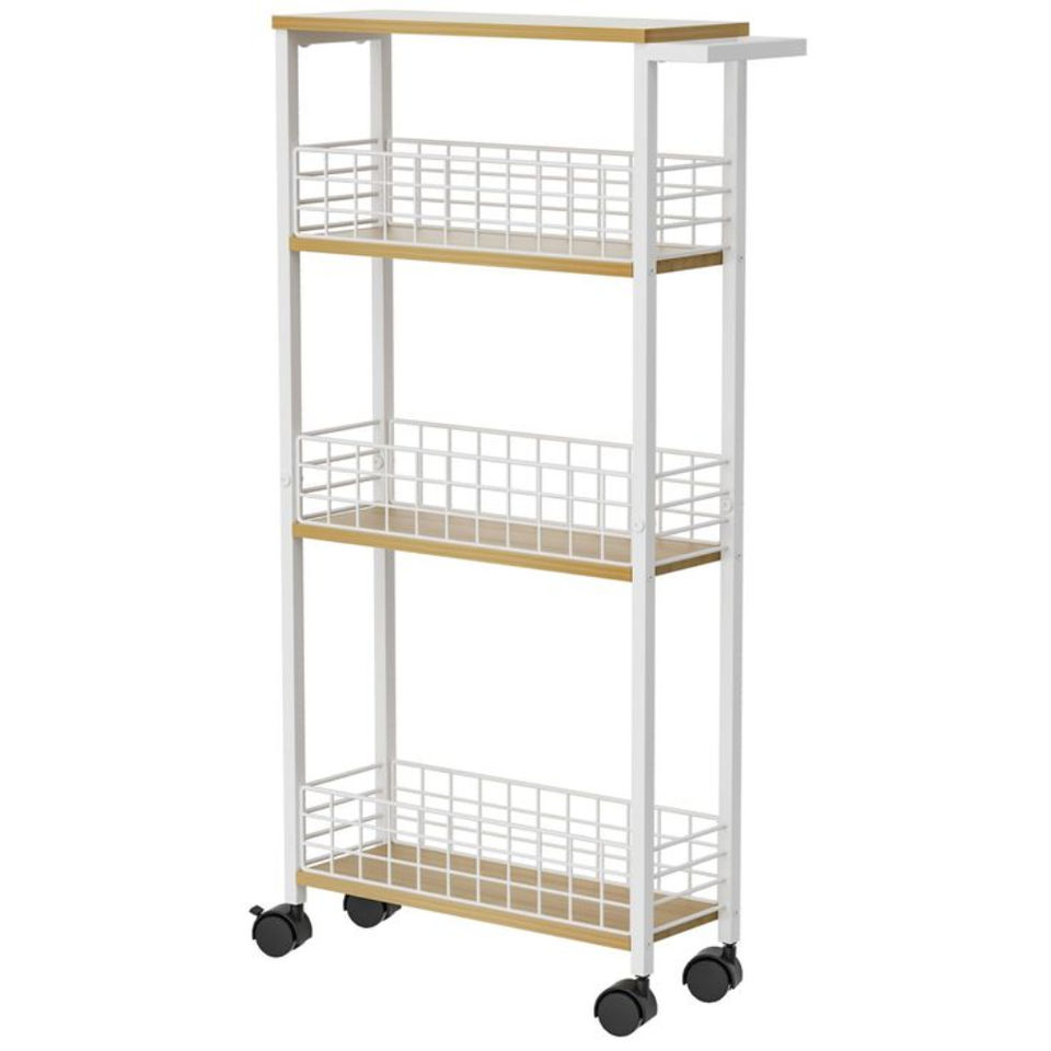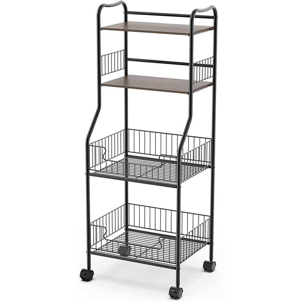 รถเข็นอเนกประสงค์สแตนเลสสีดำ 4 ชั้น แบบมีล้อ ประหยัดพื้นที่ พร้อมตะกร้าลวด สำหรับจัดเก็บของใช้ในครัวเรือน ขายส่ง