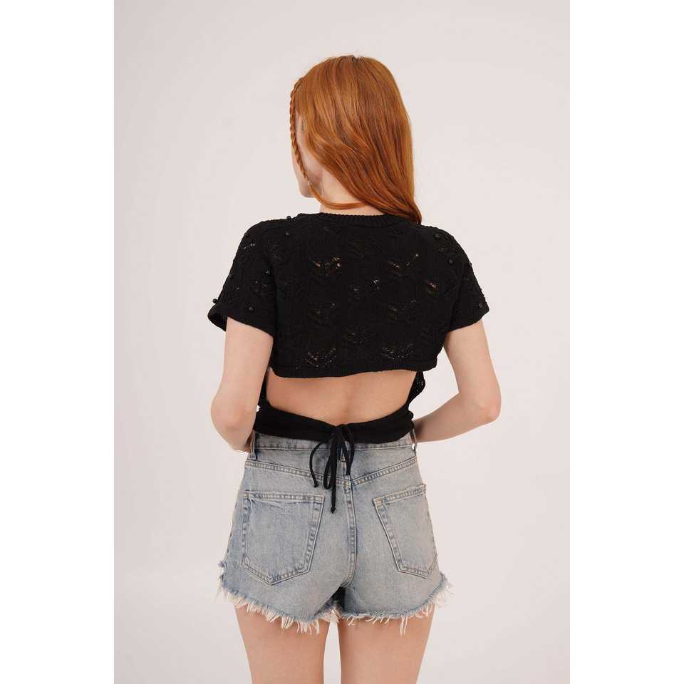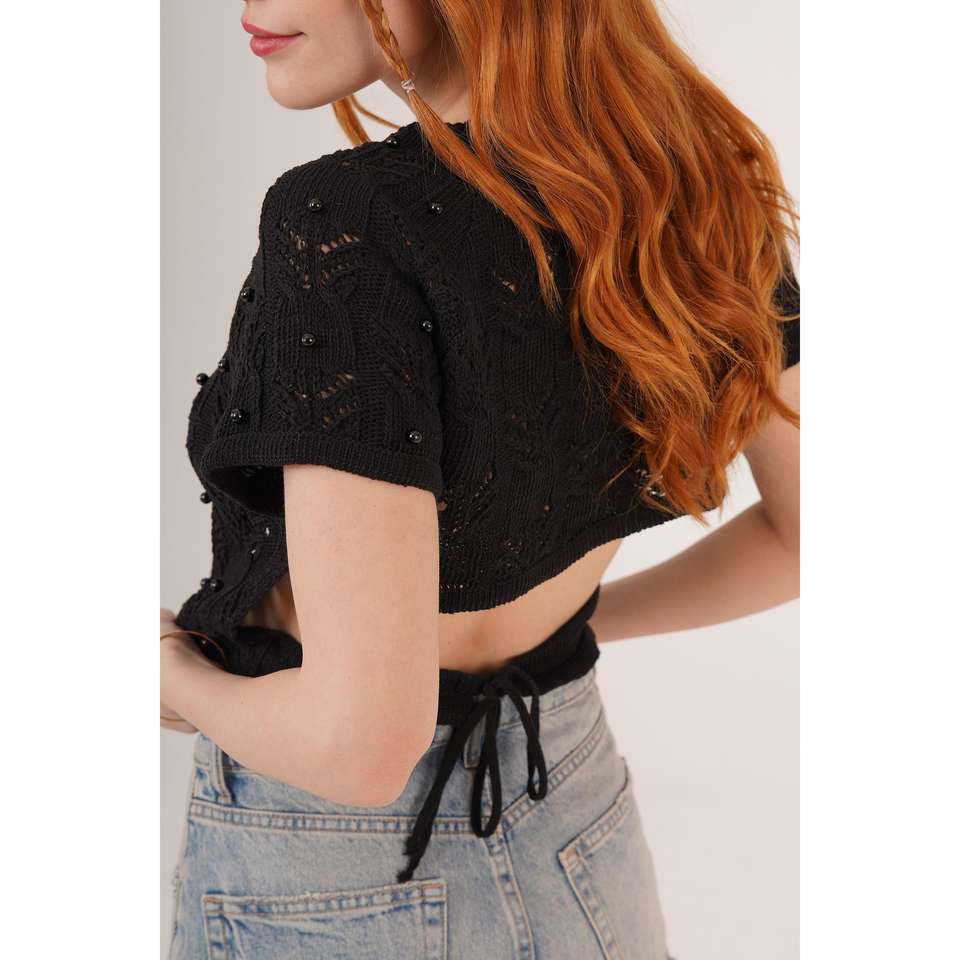 เสื้อครอปท็อปสีดำขายส่งสำหรับผู้หญิง เสื้อกล้ามถักลายทางลำลอง มีฟองน้ำในตัว ระบายอากาศได้ดี พร้อมโลโก้แบบกำหนดเอง ดีไซน์สายรัดด้านหลัง