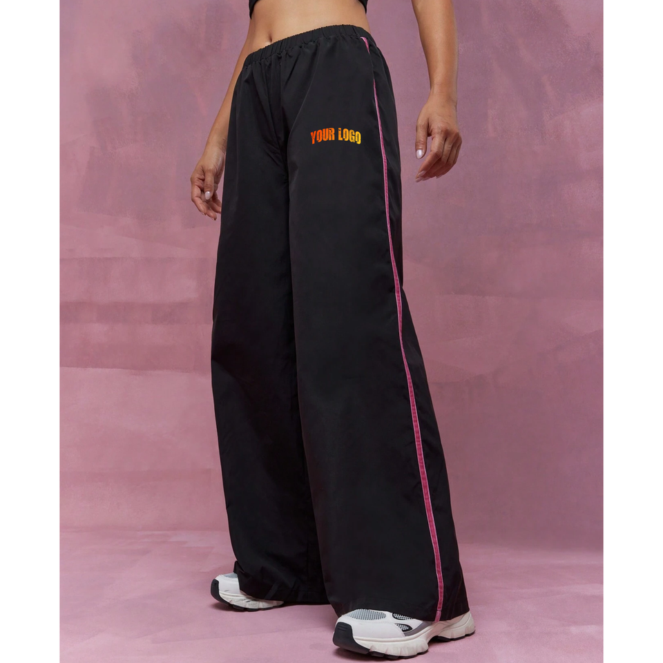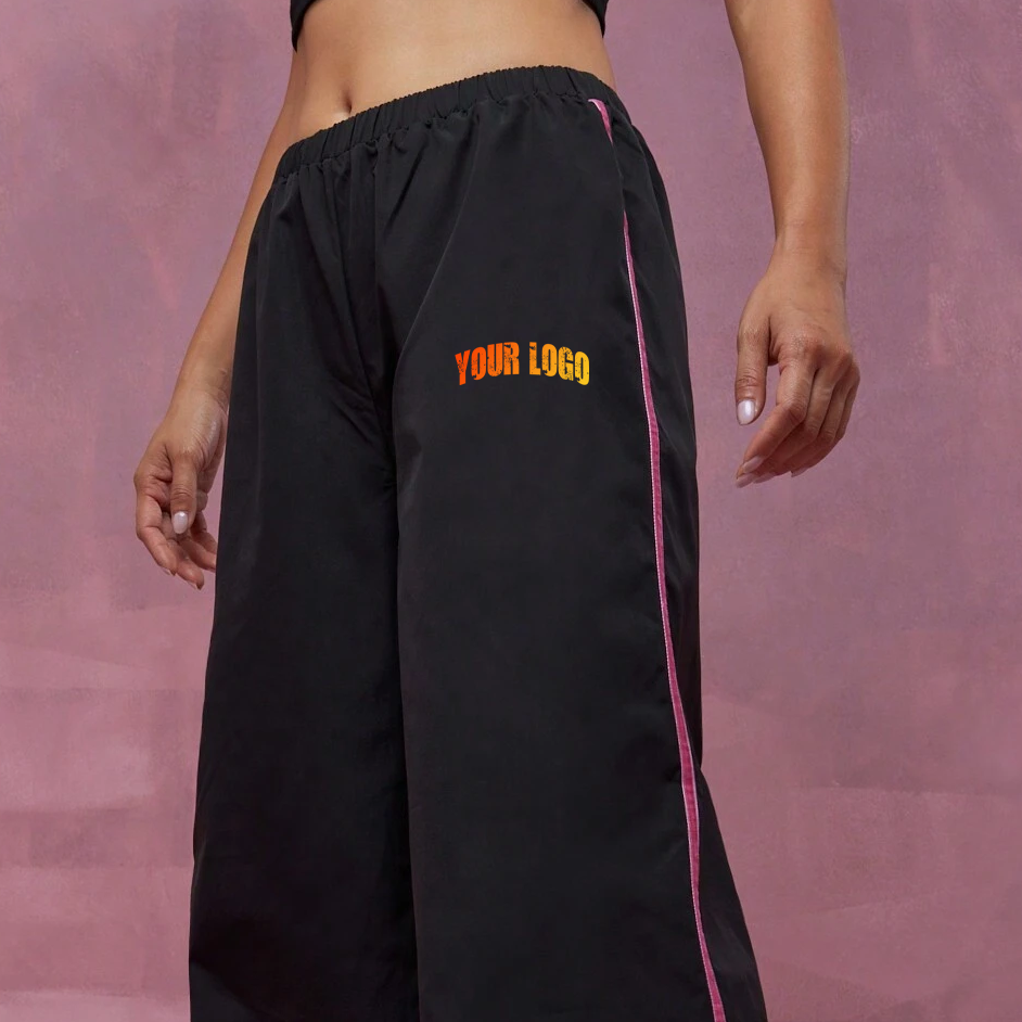กางเกงจ็อกเกอร์ขายส่งสีดำทรงบาน ผ้าฝ้ายฟลีซ 100% สวมใส่สบาย ทรงหลวม กางเกงขายาวทรงตรงขากว้างสำหรับผู้หญิง