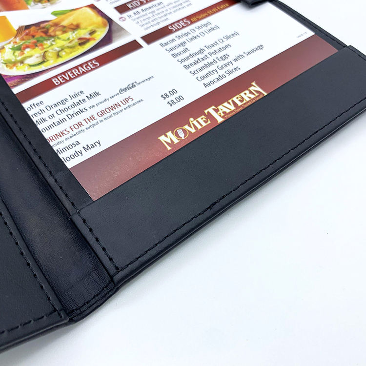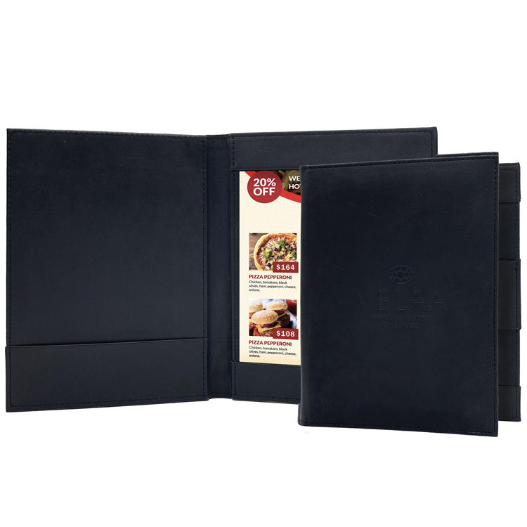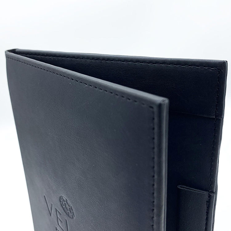 สมุดเมนูร้านอาหารปกแข็งสีดำแบบขายส่ง พร้อมที่ใส่ปากกา สมุดเมนูขนาด A4 ปกหนังรักษ์โลก