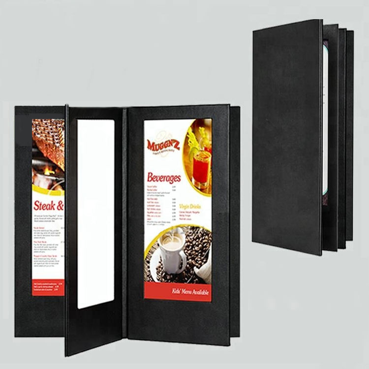 ปกเมนูหนังสีดำขนาดใหญ่แบบขายส่ง 6 หน้า พร้อมไฟ ปกเมนูหนังสำหรับร้านอาหาร ปกเมนูหนังพร้อมไฟ LED