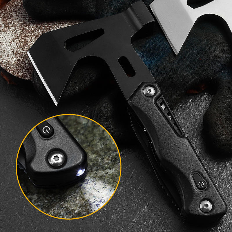 ค้อนหัวขวานอเนกประสงค์พร้อมไฟ LED สีดำขนาดกลางเพื่อความปลอดภัยในการอยู่รอดกลางแจ้ง