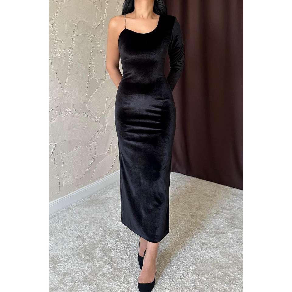 เดรสทรงเข้ารูปสีดำแบบไหล่เดียวสำหรับคนไซส์ใหญ่ พร้อมสายรัดประดับคริสตัลและเอวทรงธรรมชาติ ขายส่ง
