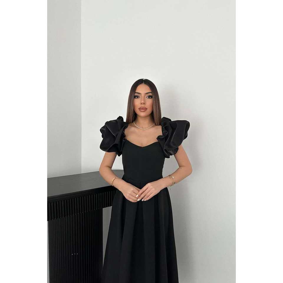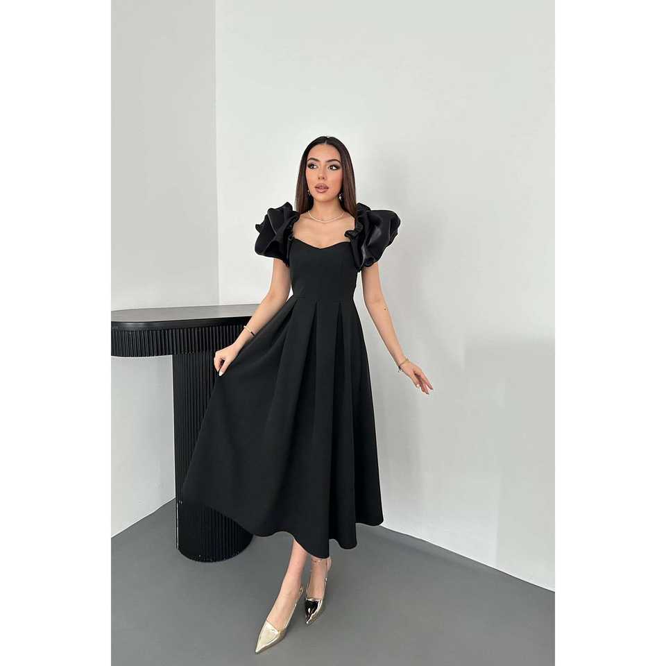 ชุดเดรสผ้าซาตินสีดำขายส่ง แขนจีบระบายทรงบอลลูน ชุดเดรสทำงานสุดหรู