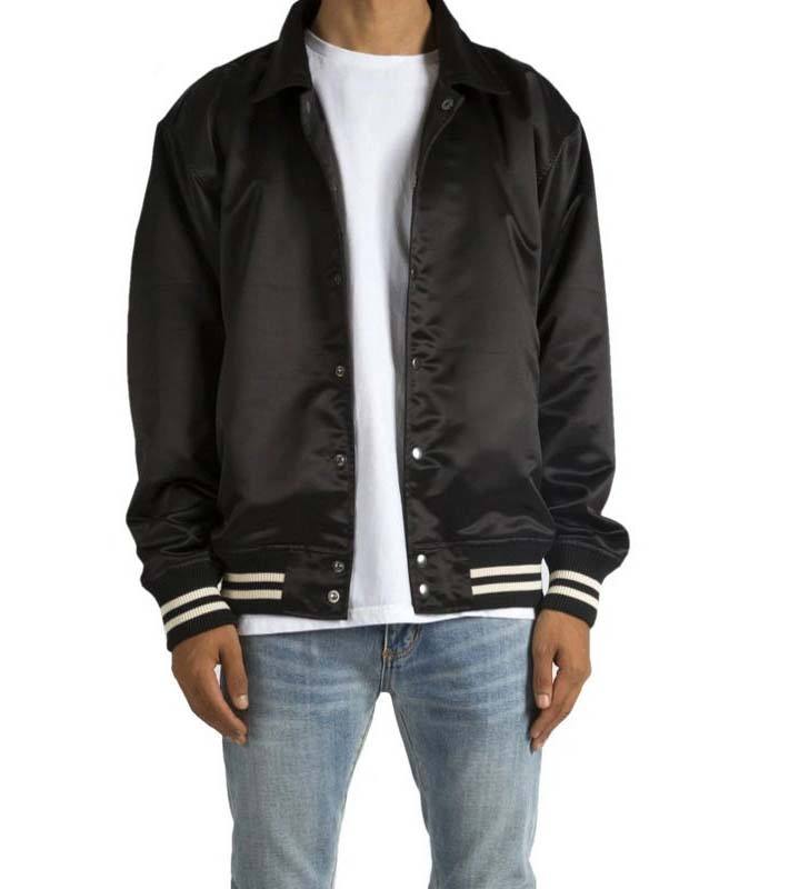แจ็คเก็ตเบสบอลแบบวาร์ซิตี้สีดำซาตินขายส่ง แจ็คเก็ตเบสบอลแบบวาร์ซิตี้ตัวอักษรบางแบบกำหนดเองสำหรับผู้ชาย