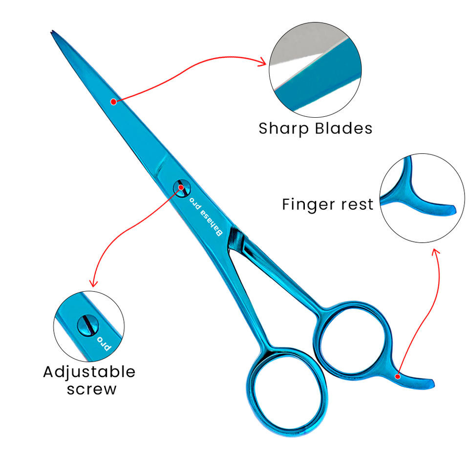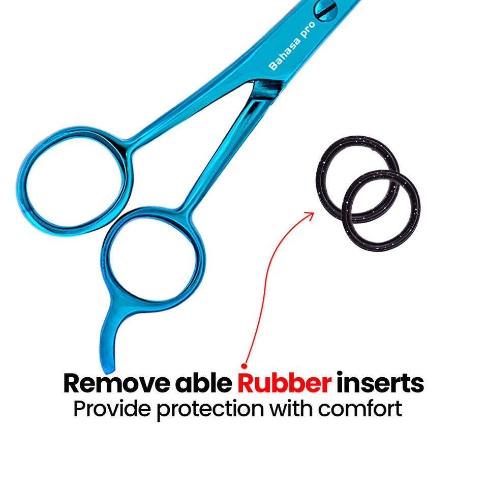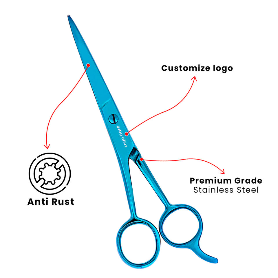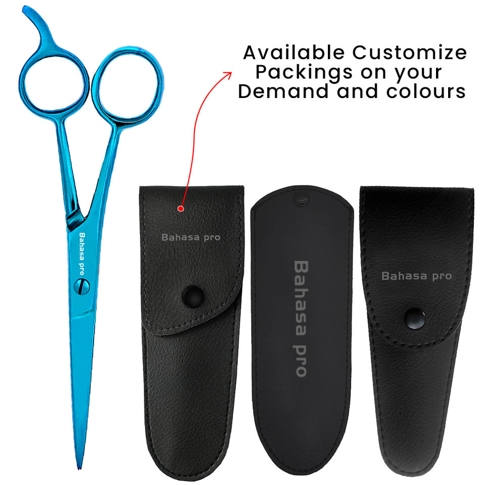 กรรไกรตัดผม Bahasa Pro ด้ามจับสแตนเลสกรรไกรตัดผมสีฟ้าแบบมืออาชีพออกแบบโลโก้ได้ตามต้องการ