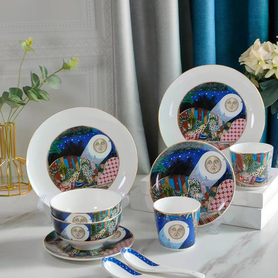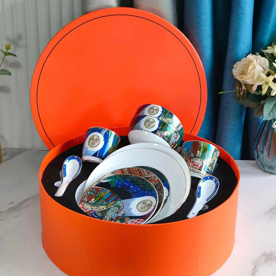 ชุดอาหารเย็นลายการ์ตูนสีฟ้าชุดชามเซรามิกและจานชุดอาหารเย็น10ชิ้นพร้อมกล่องของขวัญ