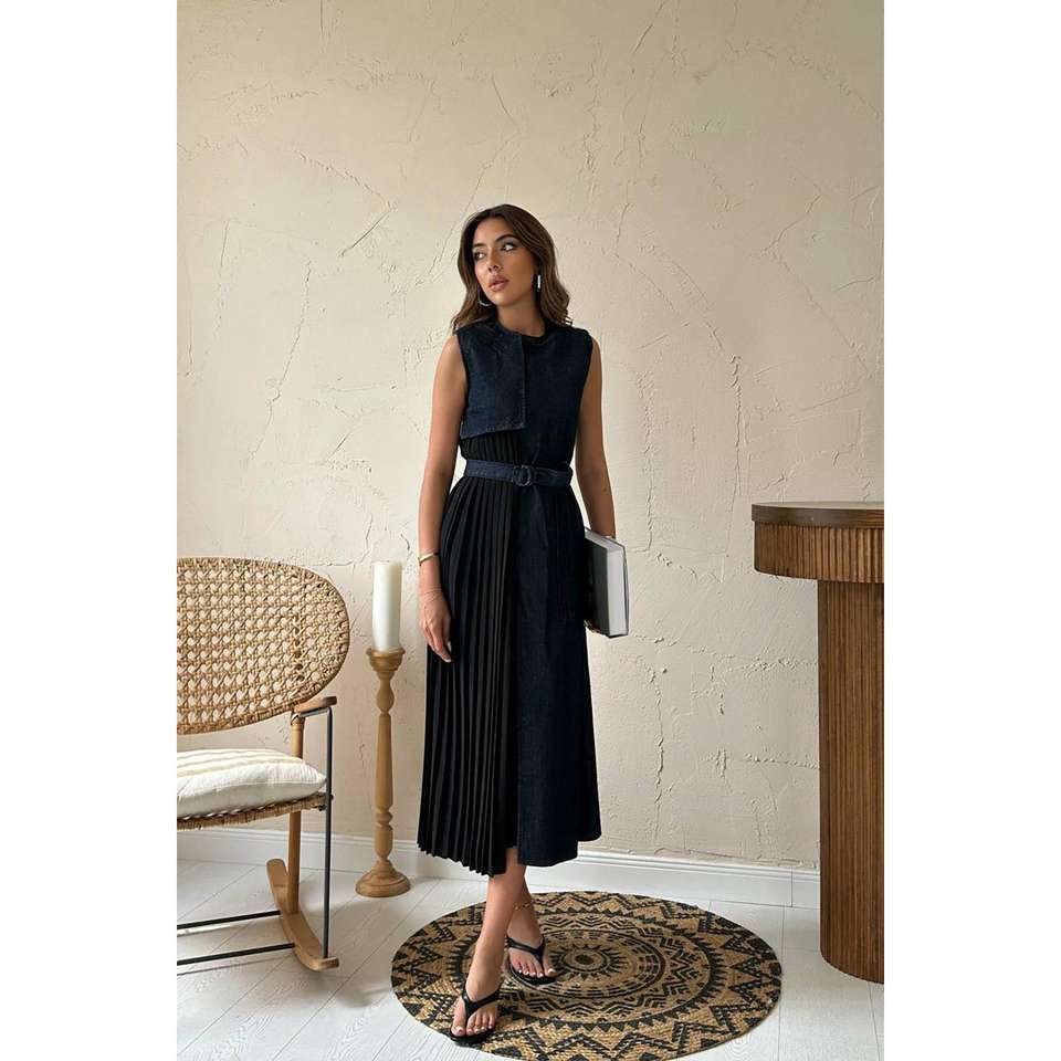 เดรสยีนส์สีน้ำเงินจีบระบายแบบขายส่งสำหรับผู้หญิง ความยาวปานกลาง แขนกุด ระบายอากาศได้ดี แฟชั่นทันสมัย