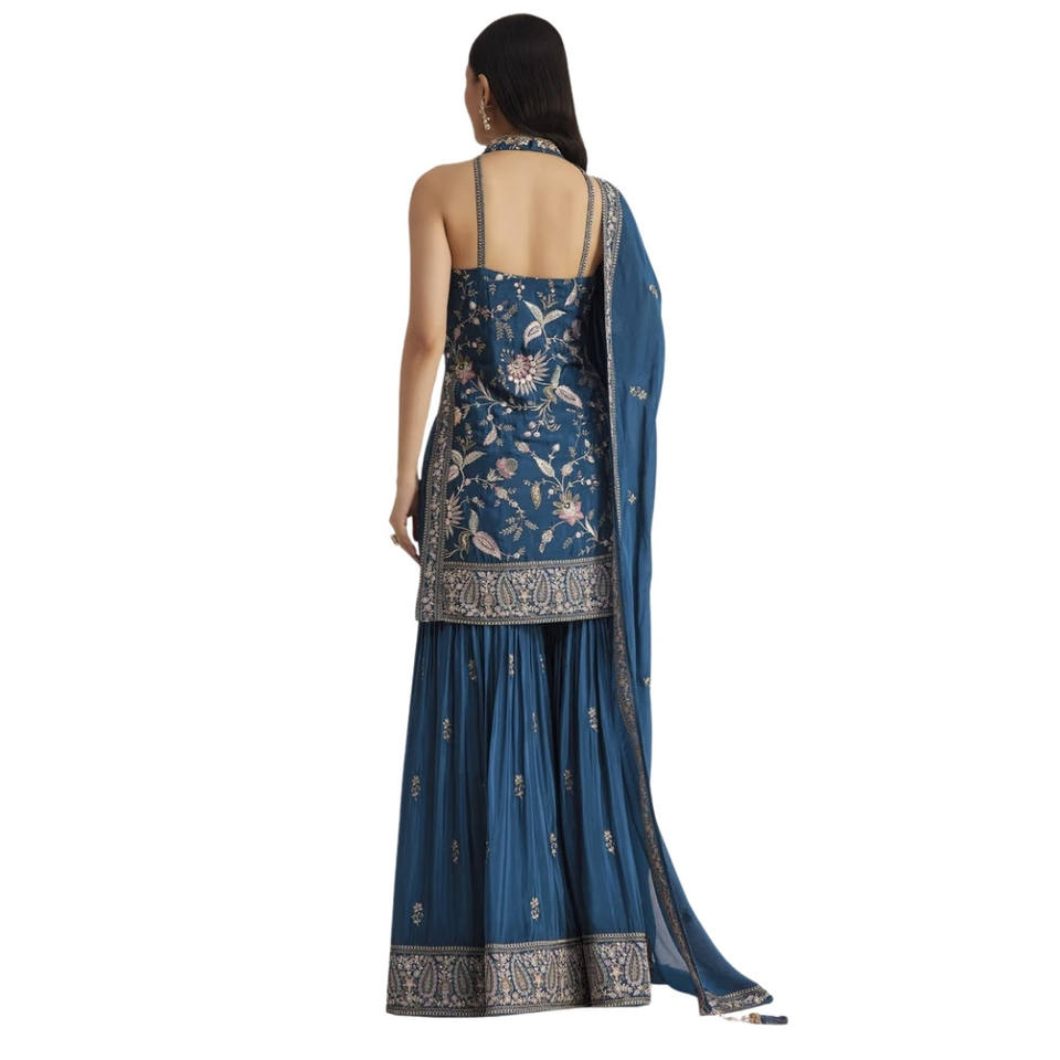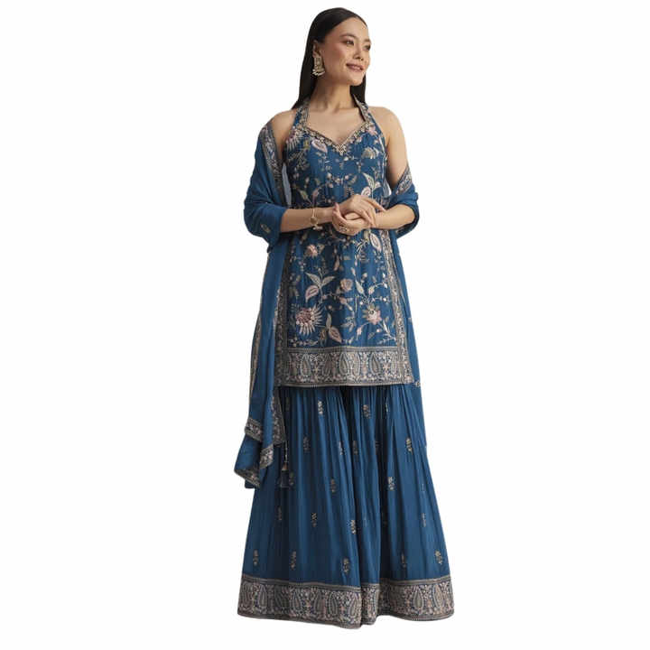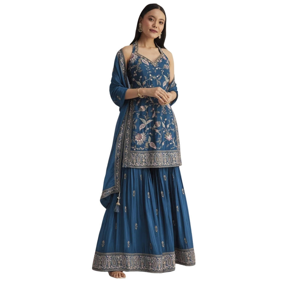 ชุดชาราร่าผ้าไหมสีน้ำเงินขายส่ง พร้อมผ้าคลุมไหล่ สำหรับงานแต่งงาน งานเลี้ยง และงานรับรอง รวมถึงสั่งตัดตามแบบพื้นเมือง
