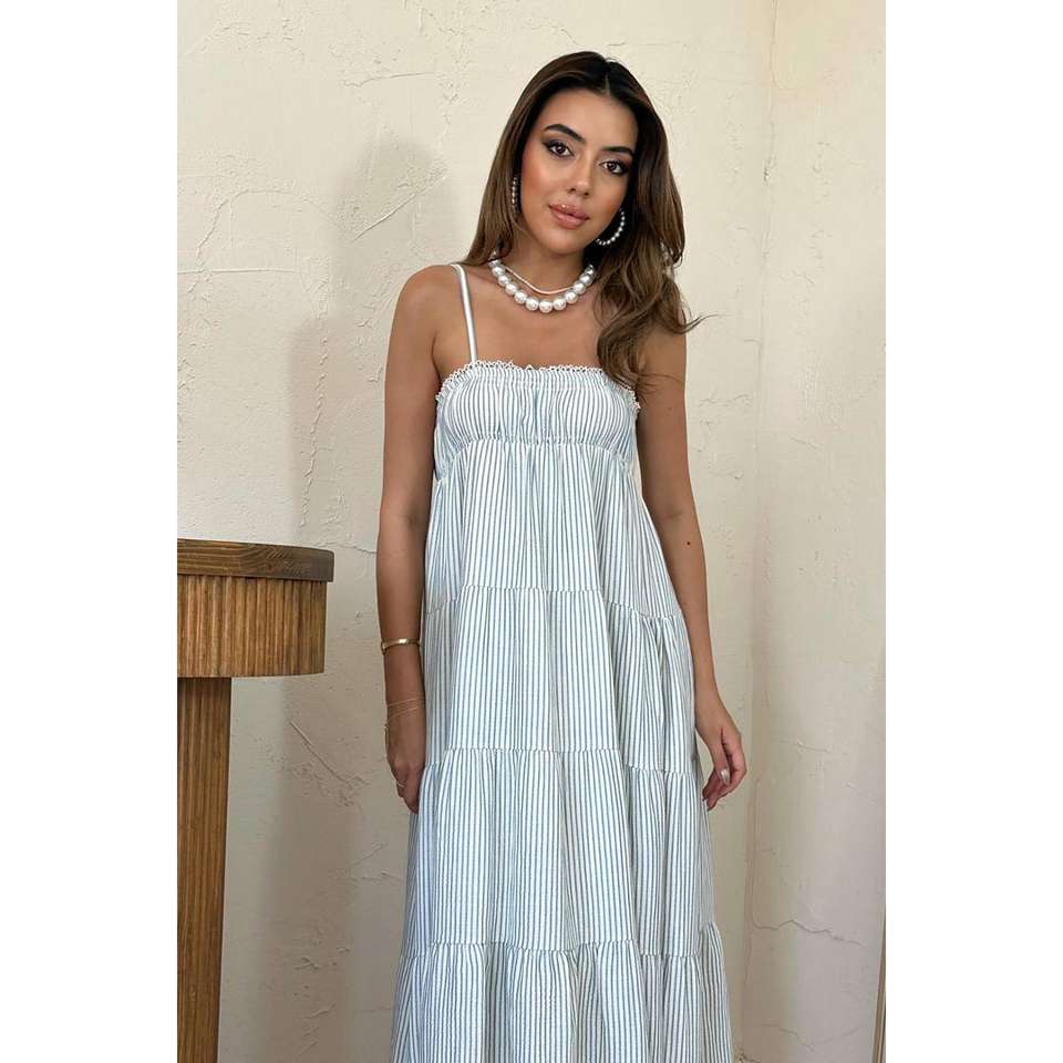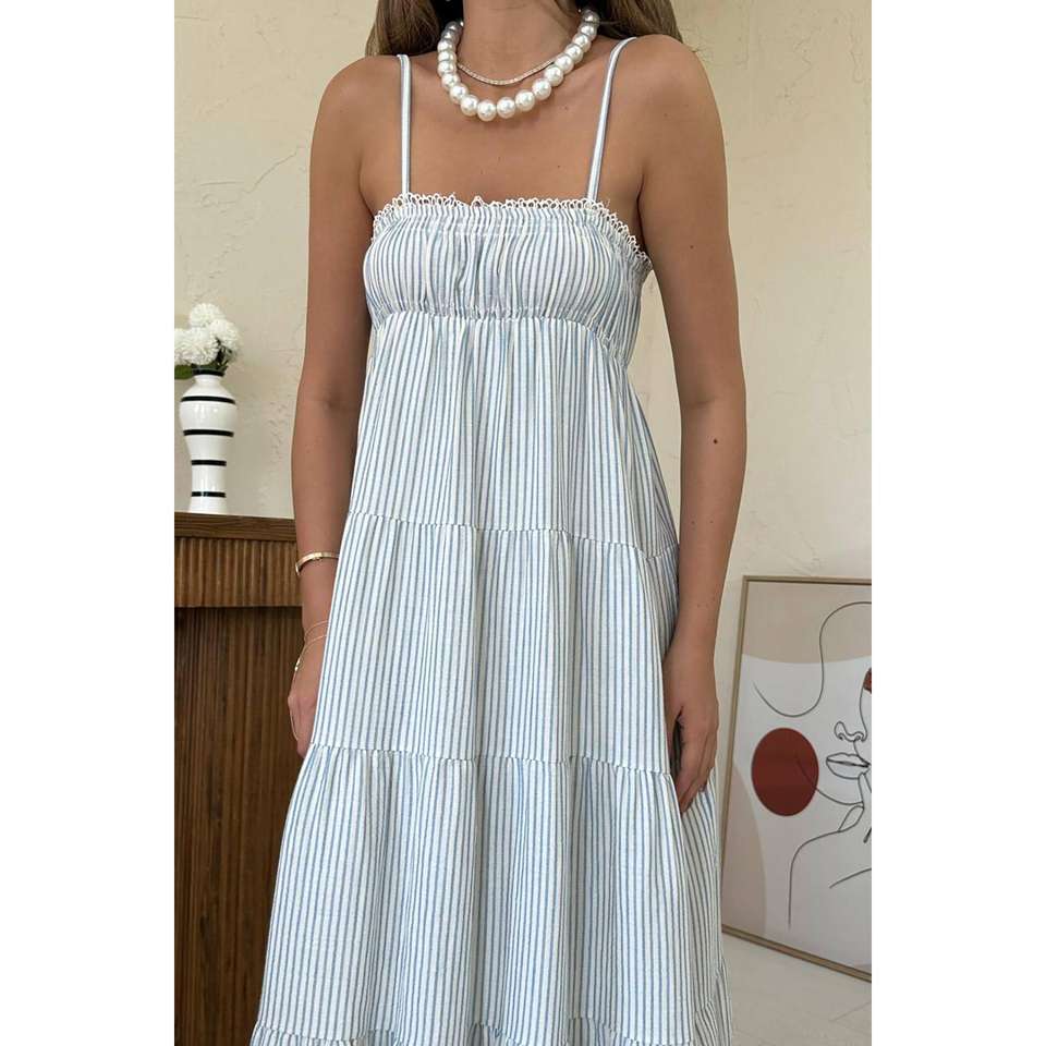 เดรสผ้ามัสลินสีน้ำเงินลายทาง สายเดี่ยว คอวี ทรงเอไลน์ ระบายชั้นๆ เอวยางยืด ใส่สบาย ระบายอากาศได้ดี เหมาะสำหรับใส่ในชีวิตประจำวัน