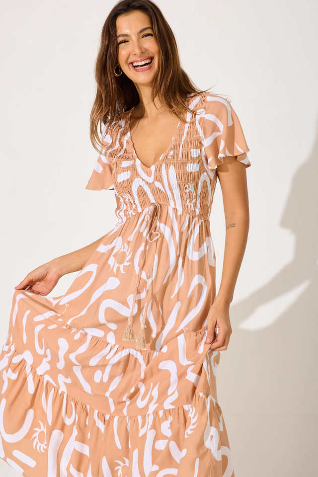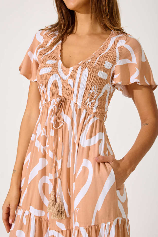 ชุดเดรสยาวสไตล์โบฮีเมียนผ้าเรยอนสำหรับขายส่ง ผูกคอด้านหน้า แต่งพู่ปักลาย ผู้ผลิตโดยตรงจากโรงงาน ลายพิมพ์ดิจิทัลธรรมชาติสำหรับผู้หญิง