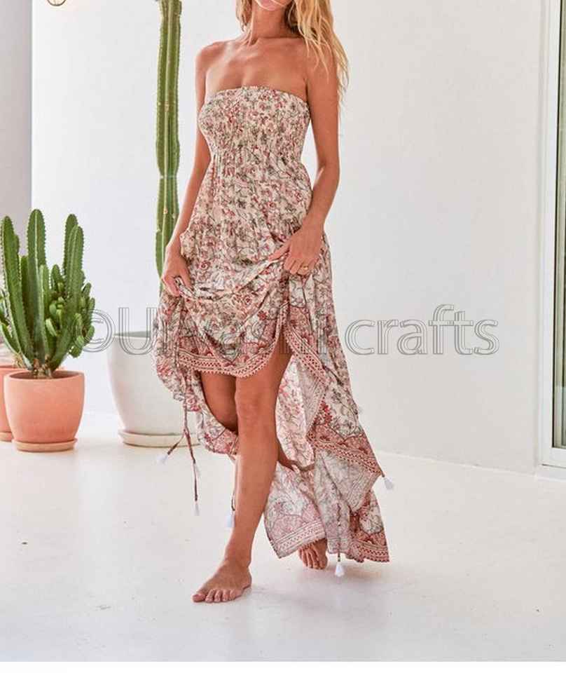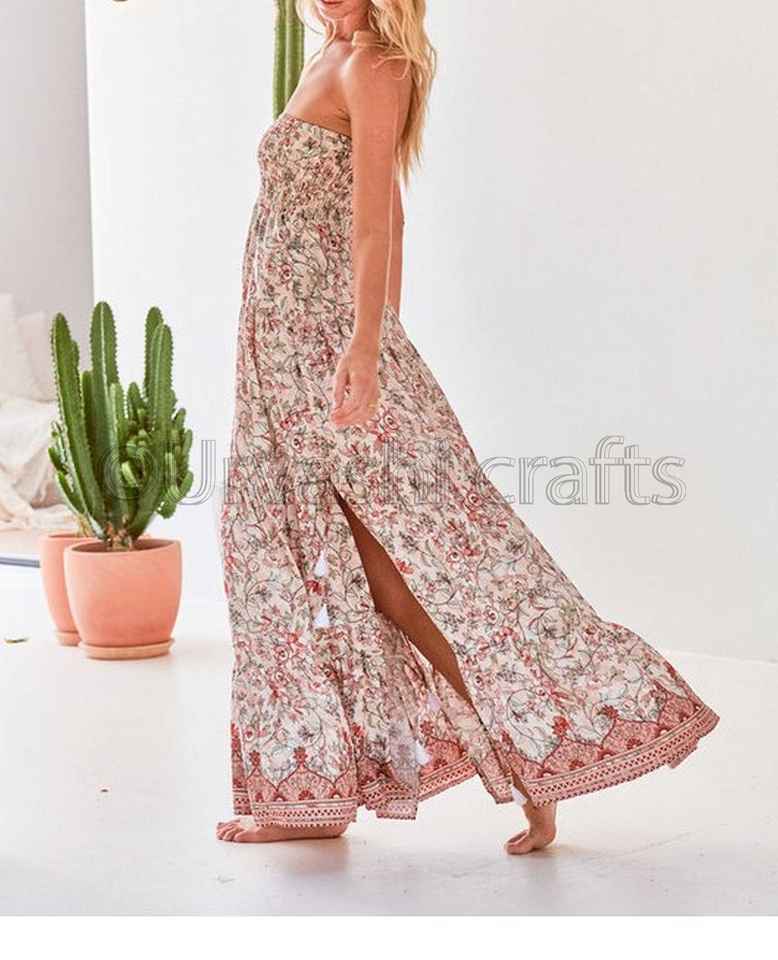 เดรสยาวเปิดไหล่พิมพ์ลายวินเทจสไตล์โบฮีเมียน