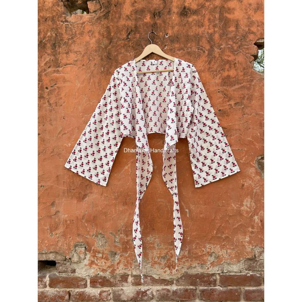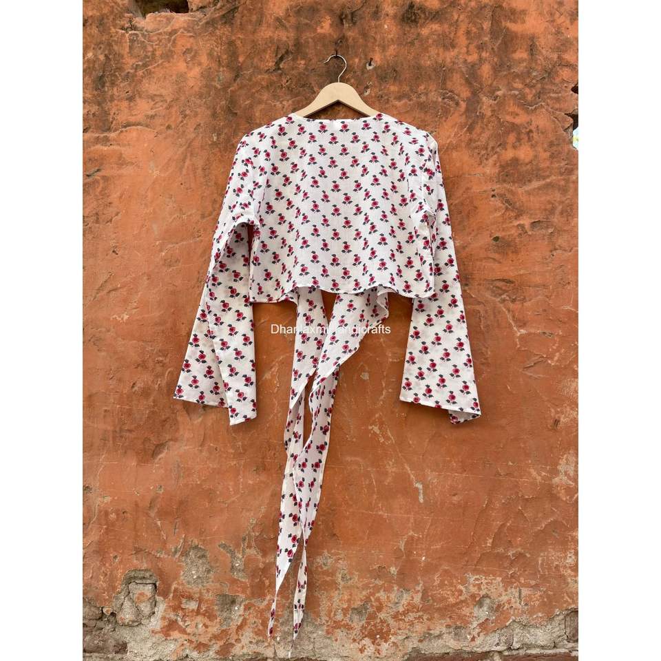 Wholesale Bohemian Style Tie Front Balloon Sleeve Crop Top Indian Hand Block Print Cotton Fabric Tunic Womens Top