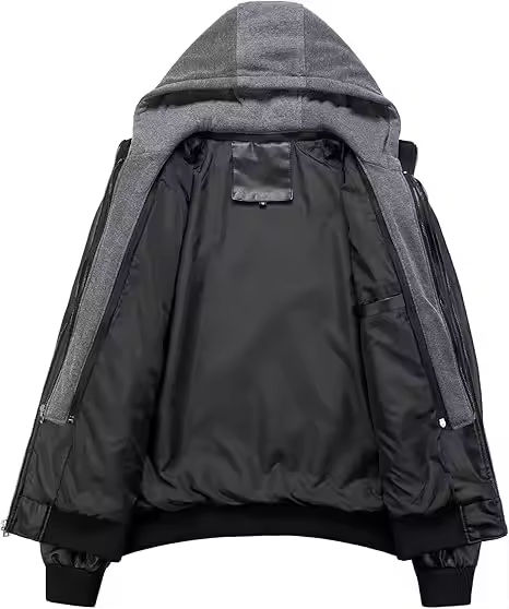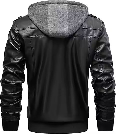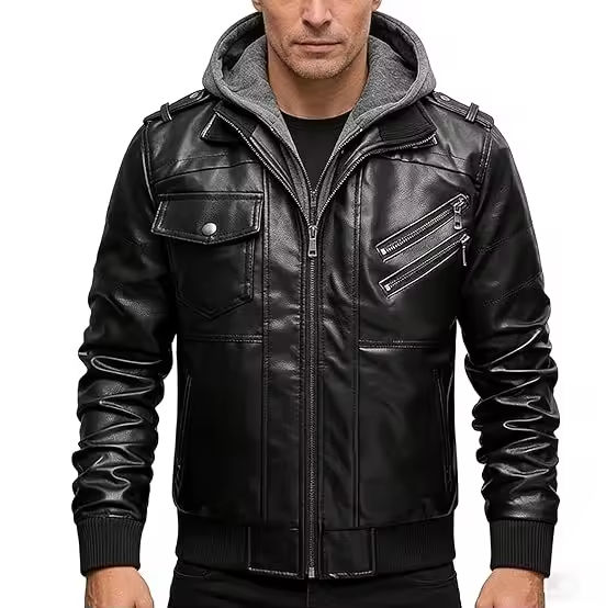 เสื้อแจ็คเก็ตหนังผู้ชายสีดำมีฮู้ด ระบายอากาศได้ดี ทันสมัย ขายส่ง | เสื้อแจ็คเก็ตหนังแท้ 100% สำหรับกิจกรรมกลางแจ้ง | สีและขนาดตามสั่ง OEM