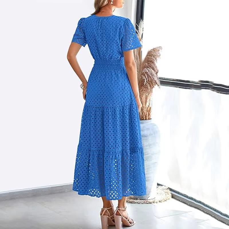 เดรสยาวแขนสั้นผ้าลูกไม้คอวีสีฟ้าสดใสสำหรับผู้หญิงสไตล์โบฮีเมียนทรงหลวมใส่ลำลองหรูหรา