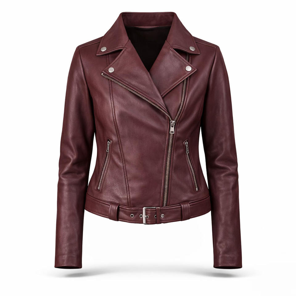 แจ็คเก็ตหนังแท้สีแดงเบอร์กันดีแบบขายส่ง ทรงเข้ารูปพร้อมเข็มขัด ซิปแบบไม่สมมาตร สีพื้น สำหรับฤดูใบไม้ร่วงและฤดูหนาว เป็นมิตรกับสิ่งแวดล้อม กันน้ำ รับผลิตแบบ OEM