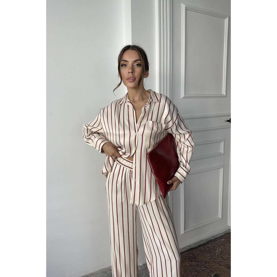 ชุดเซ็ตผ้าซาตินลายทางสีเบอร์กันดี สไตล์ลำลอง เสื้อทรงเข้ารูป กางเกงทรงสกินนี่ คอผูกโบว์ แต่งลูกไม้ ไซส์ XL สำหรับฤดูใบไม้ผลิ