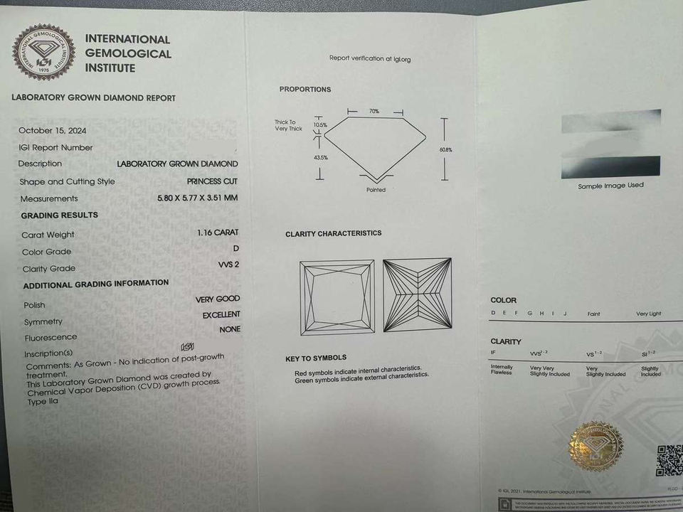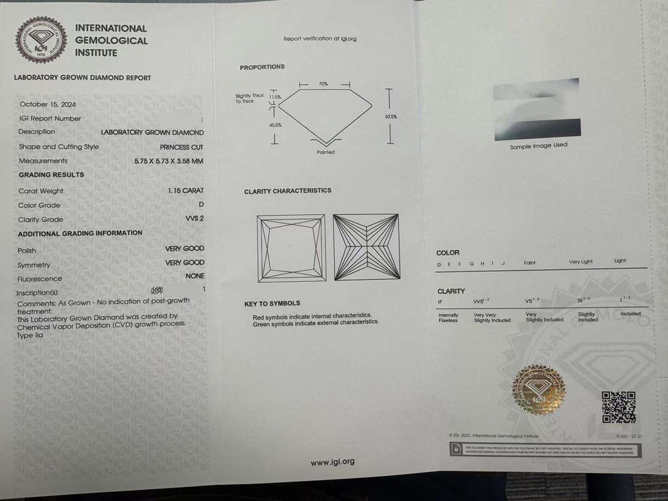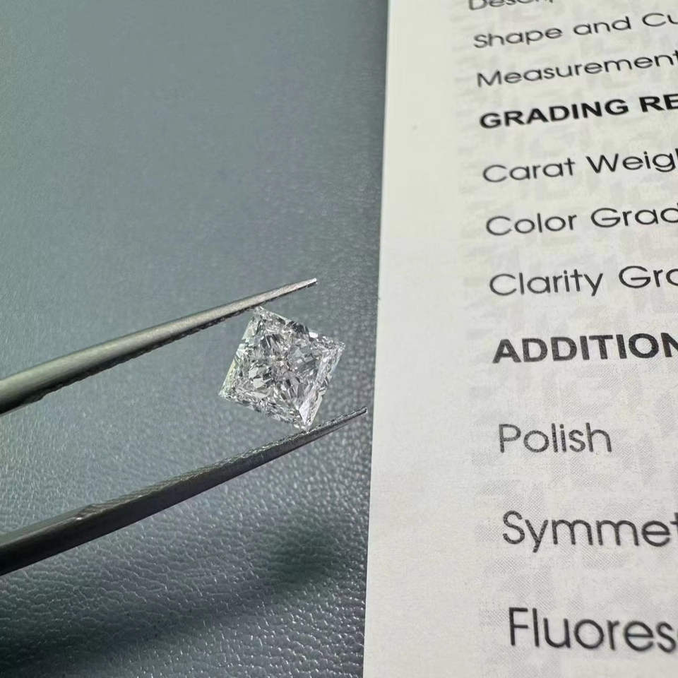 เพชรหลวมทรงปรินเซสคัท สีขาว D น้ำหนัก 1.15 กะรัต/1.16 กะรัต คุณภาพ VVS ผลิตด้วยวิธี CVD ขายส่ง พร้อมใบรับรอง IGI สำหรับทำเครื่องประดับ