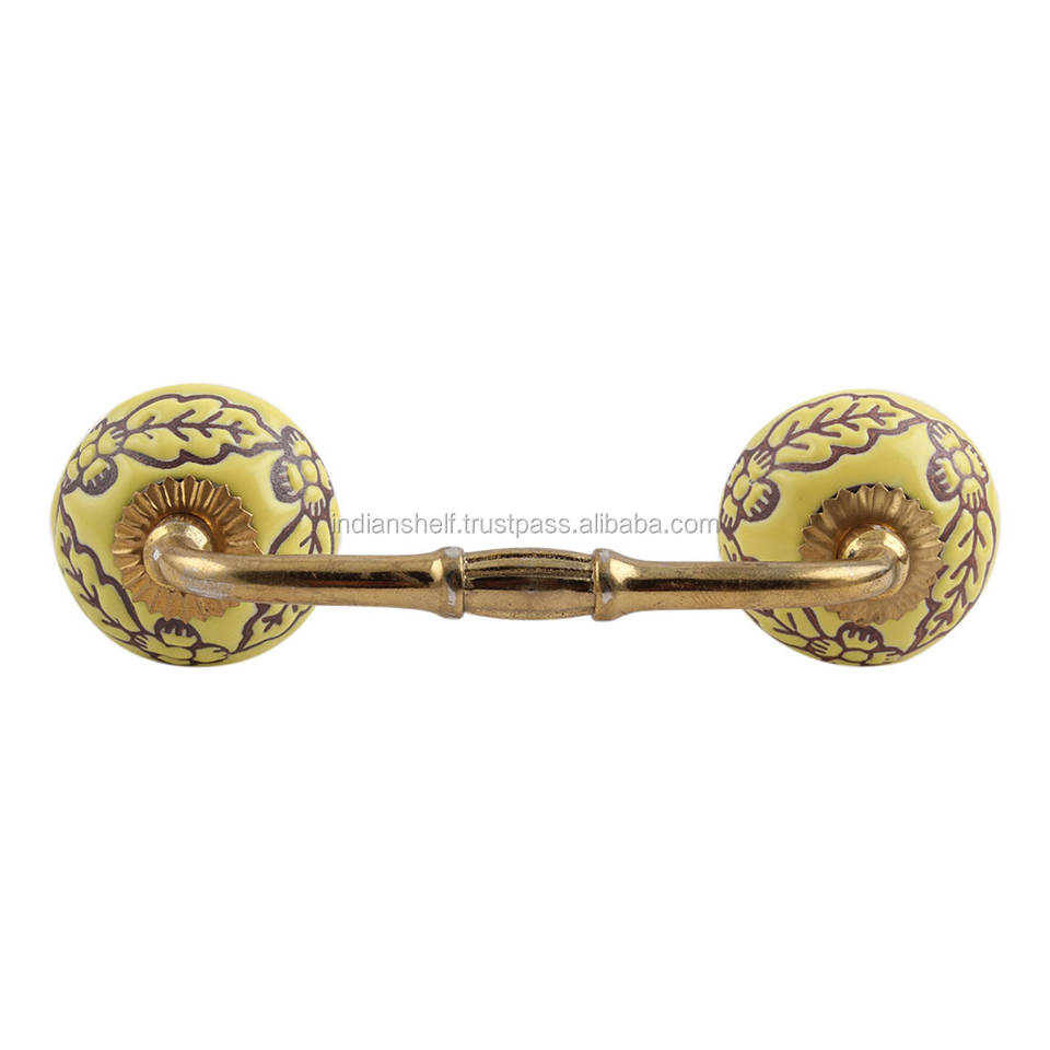 มือจับตู้ลิ้นชักสไตล์วินเทจลายดอกไม้ทำด้วยมือด้ามจับประตูบานเซรามิกสีเหลืองมีเอกลักษณ์