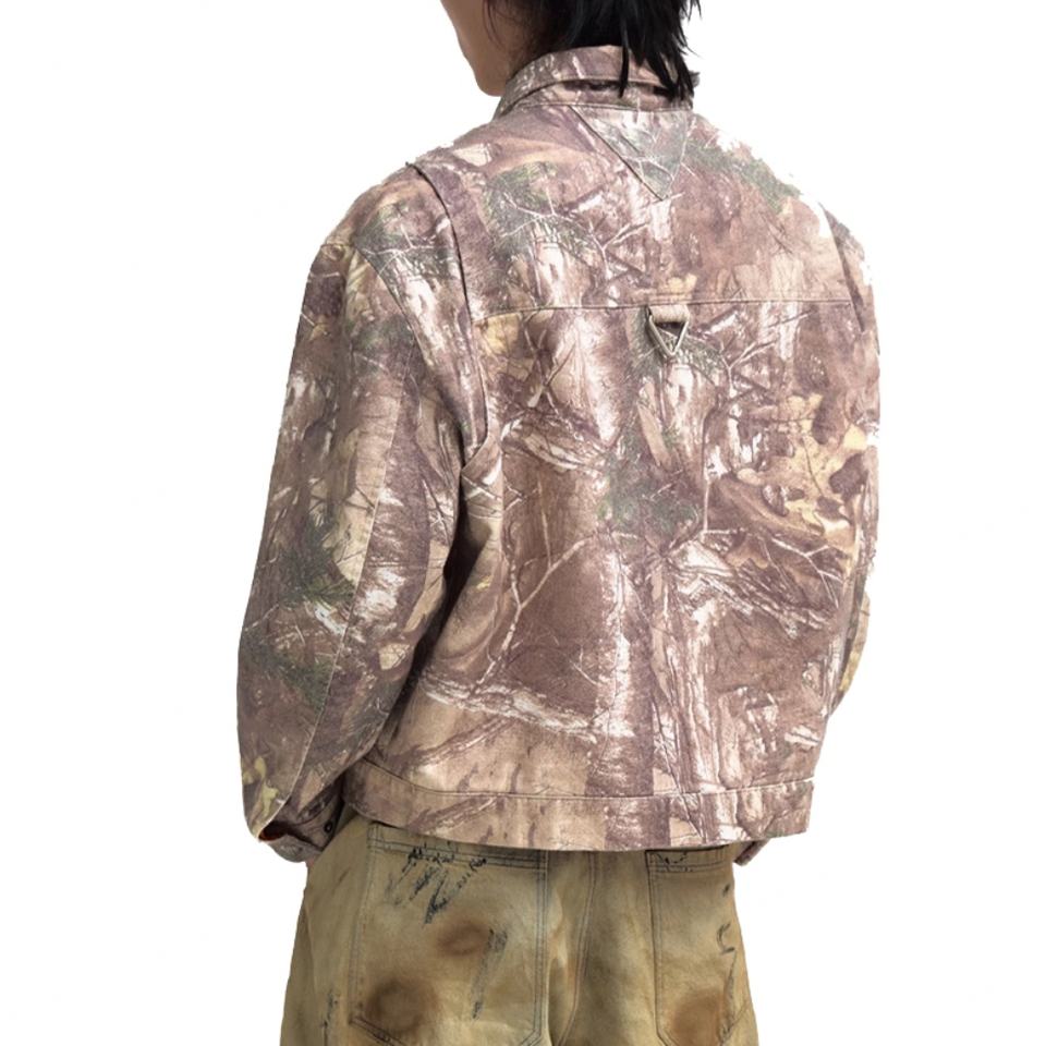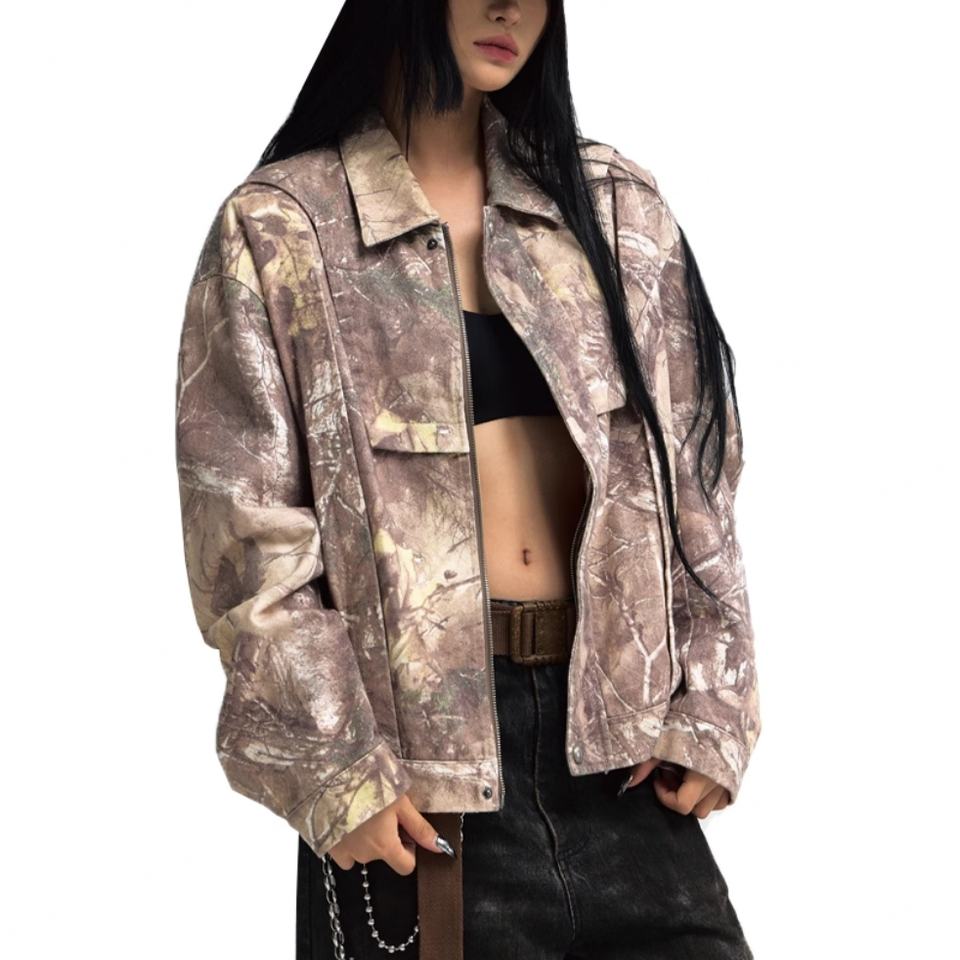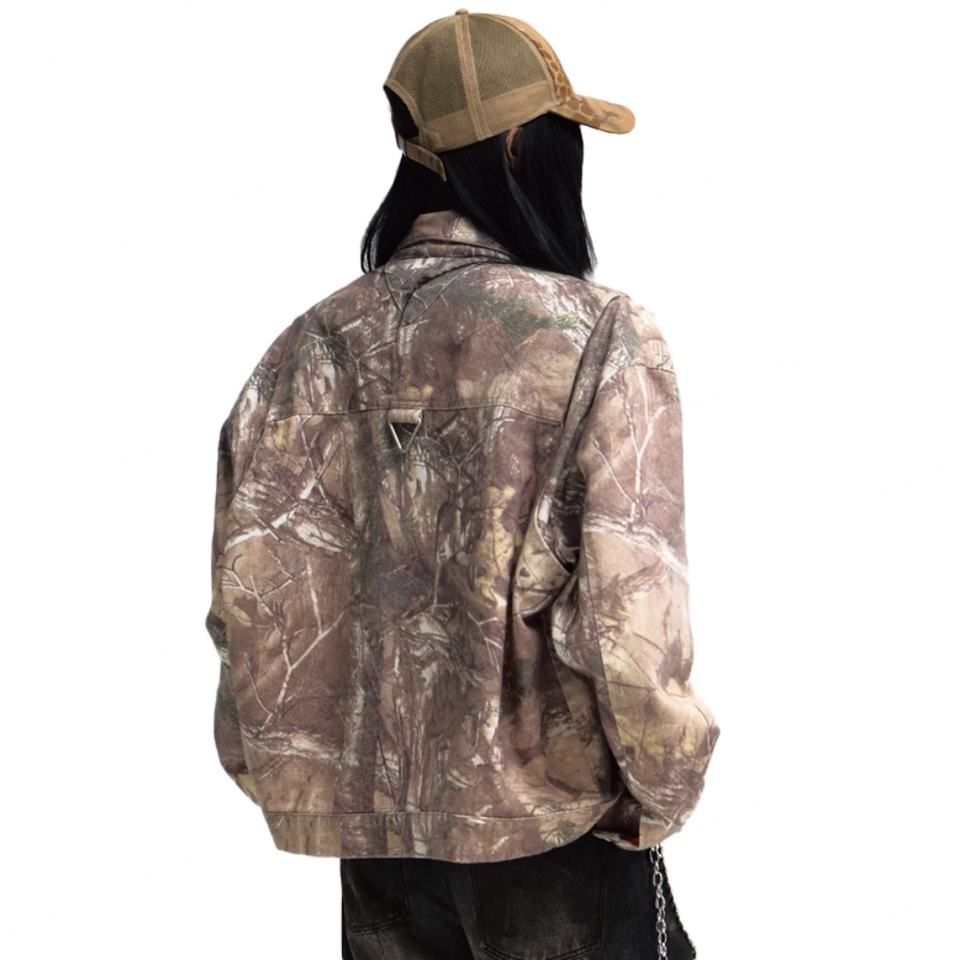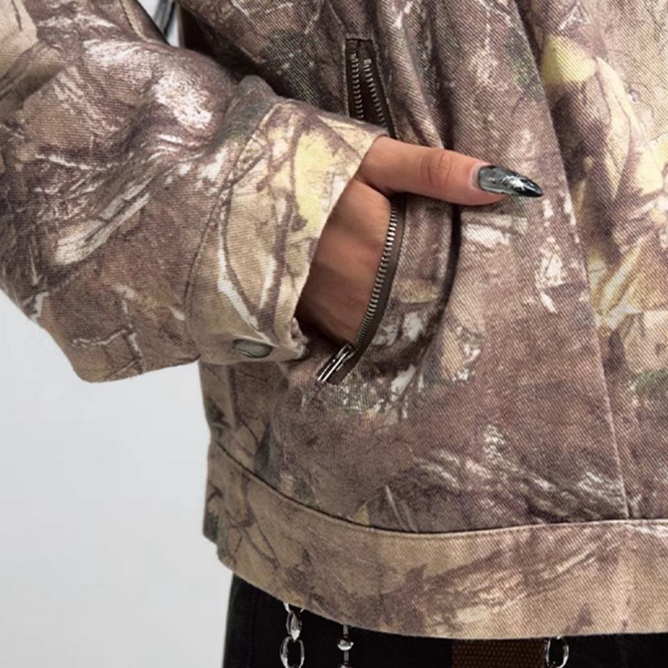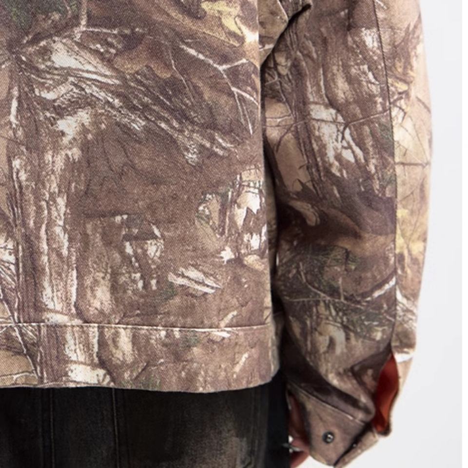 แจ็คเก็ตยีนส์ลำลองผู้ชายสไตล์สตรีท 14 ออนซ์ ขายส่ง ลายพรางพิมพ์ลายต้นไม้จริง ปกเสื้อแบบปกเชิ้ต แจ็คเก็ตบอมเบอร์ยีนส์ผู้ชาย