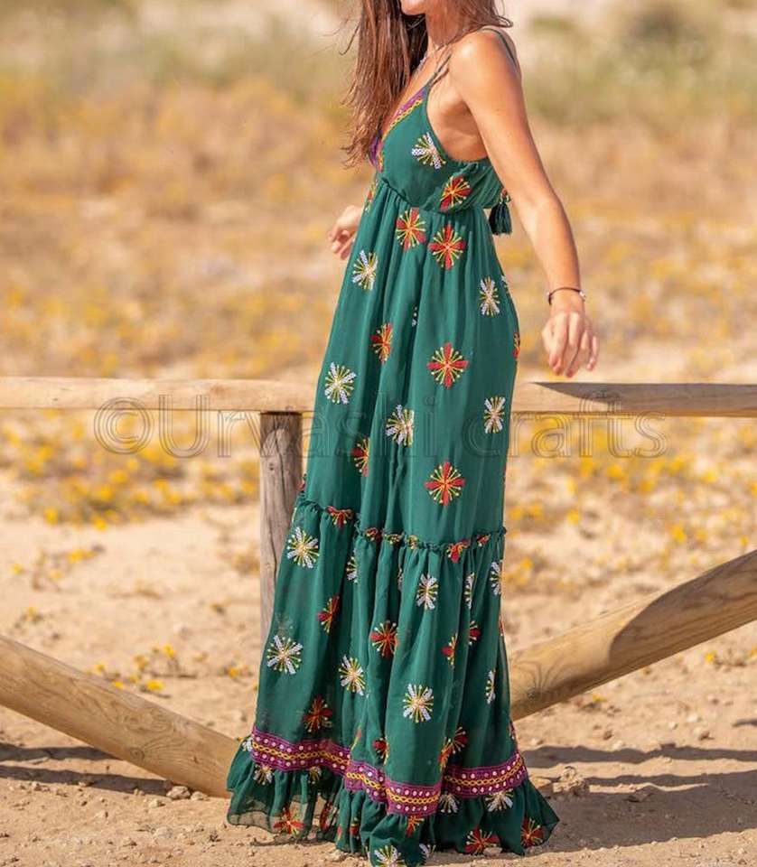 เดรสแม็กซี่ลายดอกไม้สำหรับผู้หญิงชุดเดรสลำลองสายรัดสปาเก็ตตี้ปักด้วยมือ