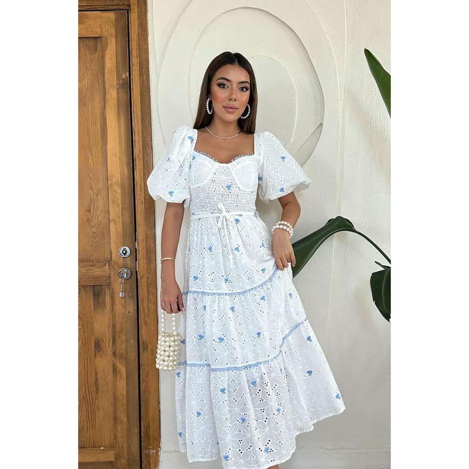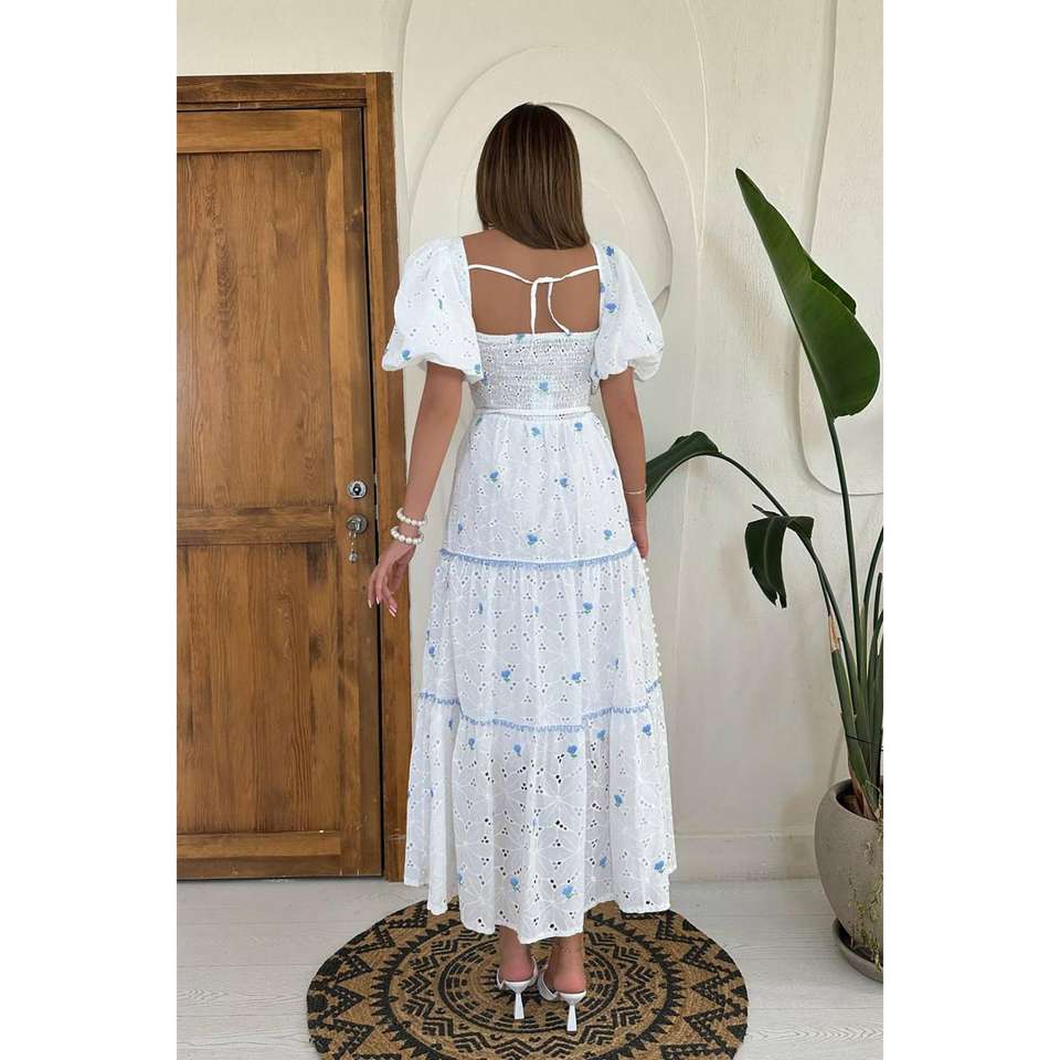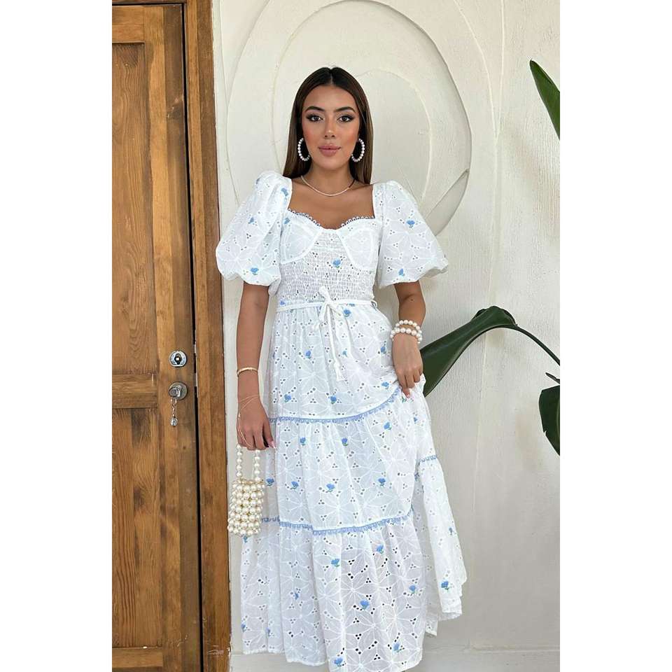 เดรสลำลองสีน้ำเงินปักลายลูกไม้ประดับเพชรแบบโปร่ง ไซส์ XS-XL ความยาวระดับเข่า เหมาะสำหรับใส่ไปเที่ยวคลับหรือทำกิจกรรมต่างๆ