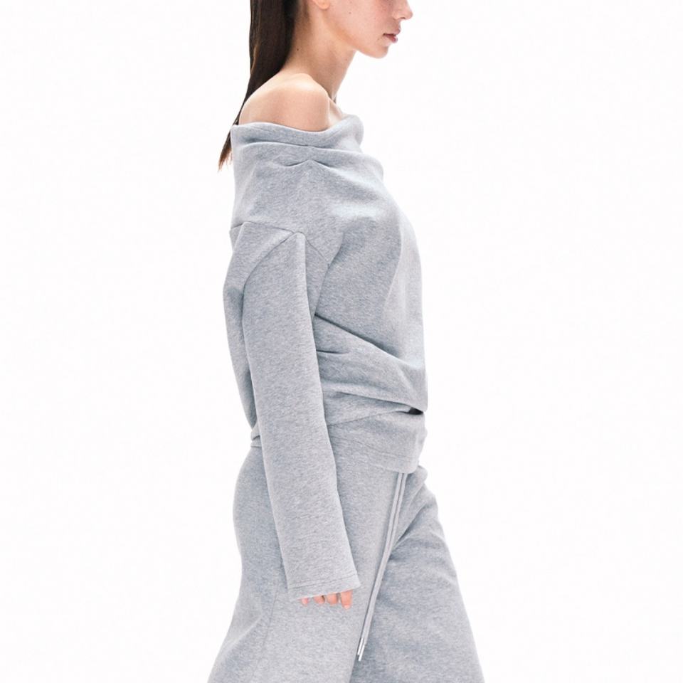 เสื้อสเวตเชิ้ตผู้หญิงแบบลำลองไหล่เดียว ทรงหลวม เซ็กซี่ ผ้าฝ้าย 100% นุ่มสบาย สีเทา เสื้อยืดแขนยาวผู้หญิง ขายส่ง
