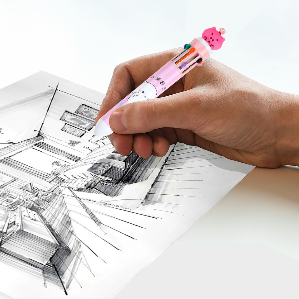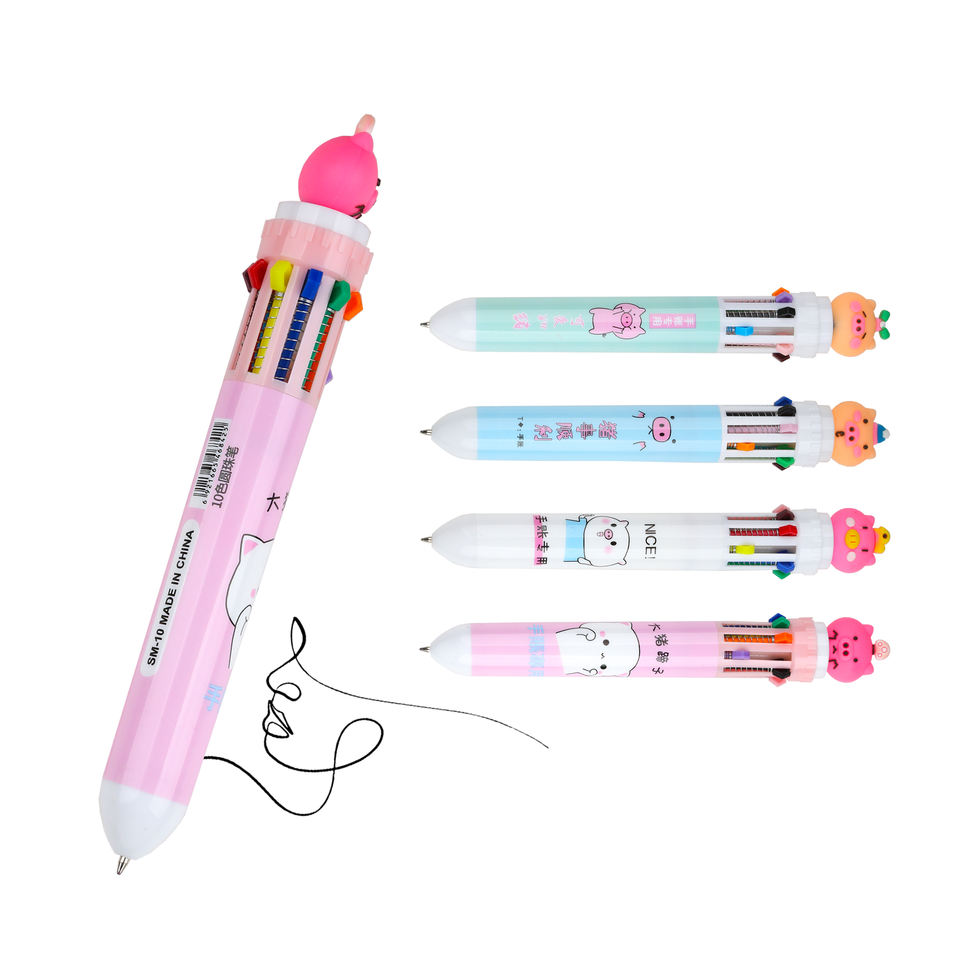 ปากกาลูกลื่นพลาสติกแบบกด 10 สีในด้ามเดียว ลายการ์ตูนน่ารัก ราคาส่งถูก สำหรับนักเรียน