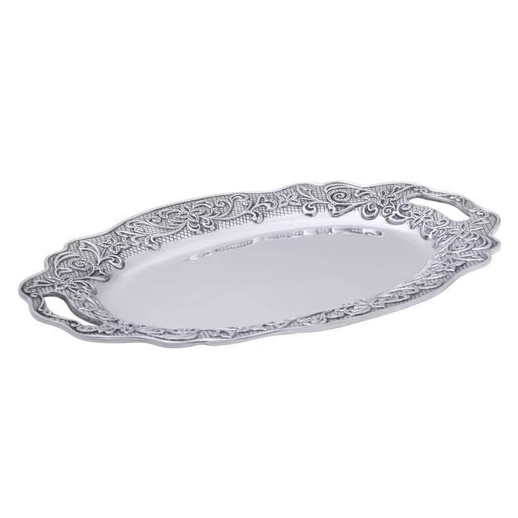 ถาดเสิร์ฟอาหารทรงรีสำหรับตกแต่งโต๊ะอาหารดีไซน์เนอร์ทำจากสเตนเลสสตีลสีเงินสำหรับบ้านและโรงแรม