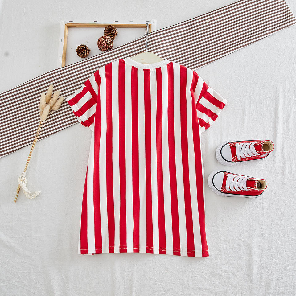 ชุดเดรสเด็กผู้หญิงลายเชฟรอนขายส่ง เสื้อผ้าเด็กผู้หญิงแขนสั้นลายสปอร์ต ชุดเดรสผ้าฝ้ายเด็กอ่อนแฟชั่น เสื้อยืดฤดูร้อน