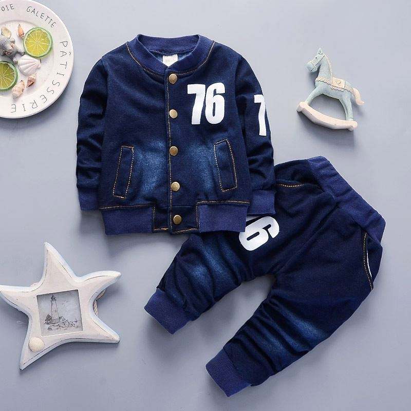 เสื้อผ้าเด็กขายส่ง ชุดเสื้อโค้ทสีน้ำเงินและกางเกงยีนส์ 2 ชิ้น ชุดเด็กผู้ชาย