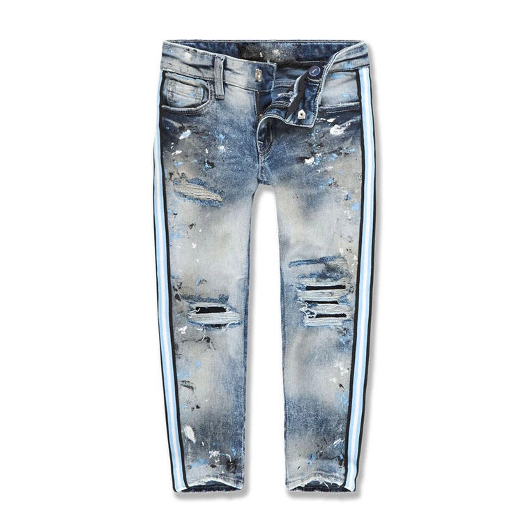 กางเกงยีนส์เด็กขายส่ง เอวยางยืด พิมพ์ลายทางด้านข้าง ขาดๆ ตรงขา ทรงตรง สำหรับเด็กผู้ชาย