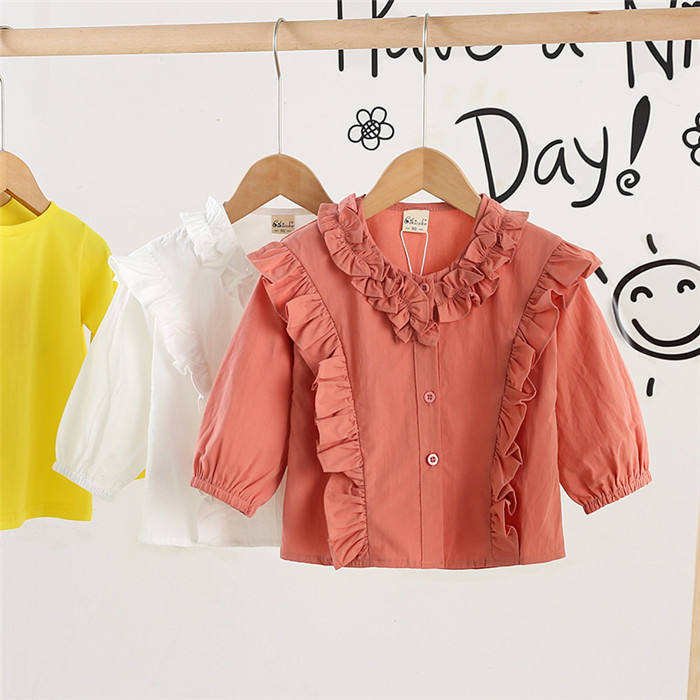 เสื้อเชิ้ตเด็กผู้หญิงสไตล์เกาหลี แขนยาว ลายดอกไม้ สีพื้น