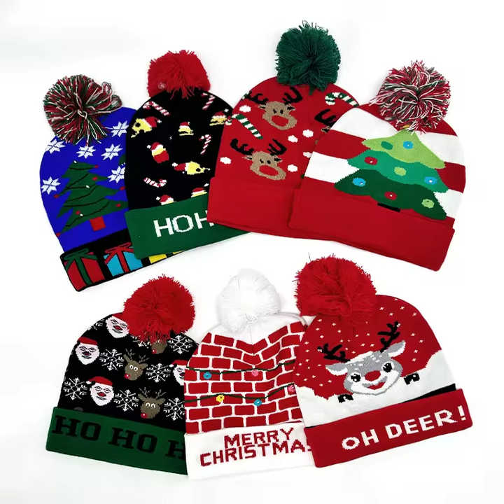 หมวกไหมพรมปอมปอมปอมปอมเบิ้ลถักอะคริลิคขนสัตว์100% ระบายอากาศกันน้ำไฟ LED โลโก้ตามสั่งสำหรับเทศกาลคริสต์มาส