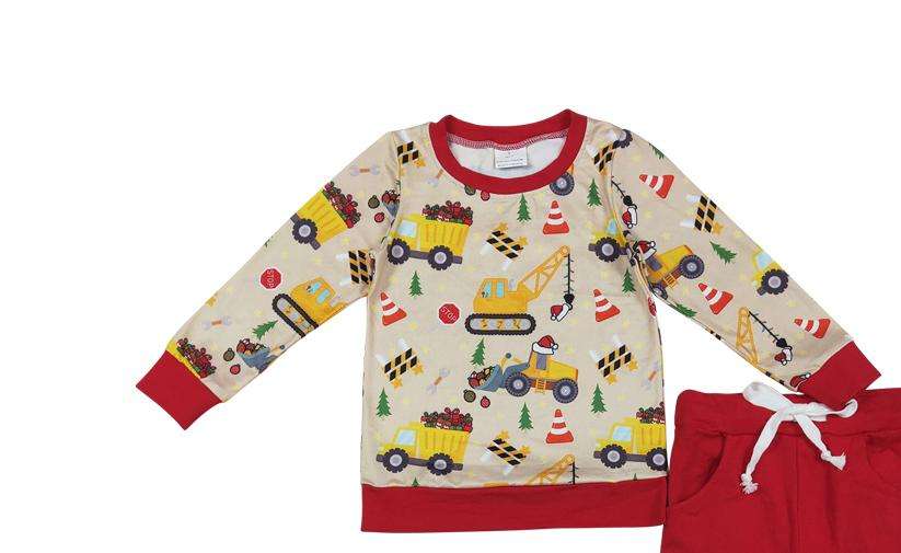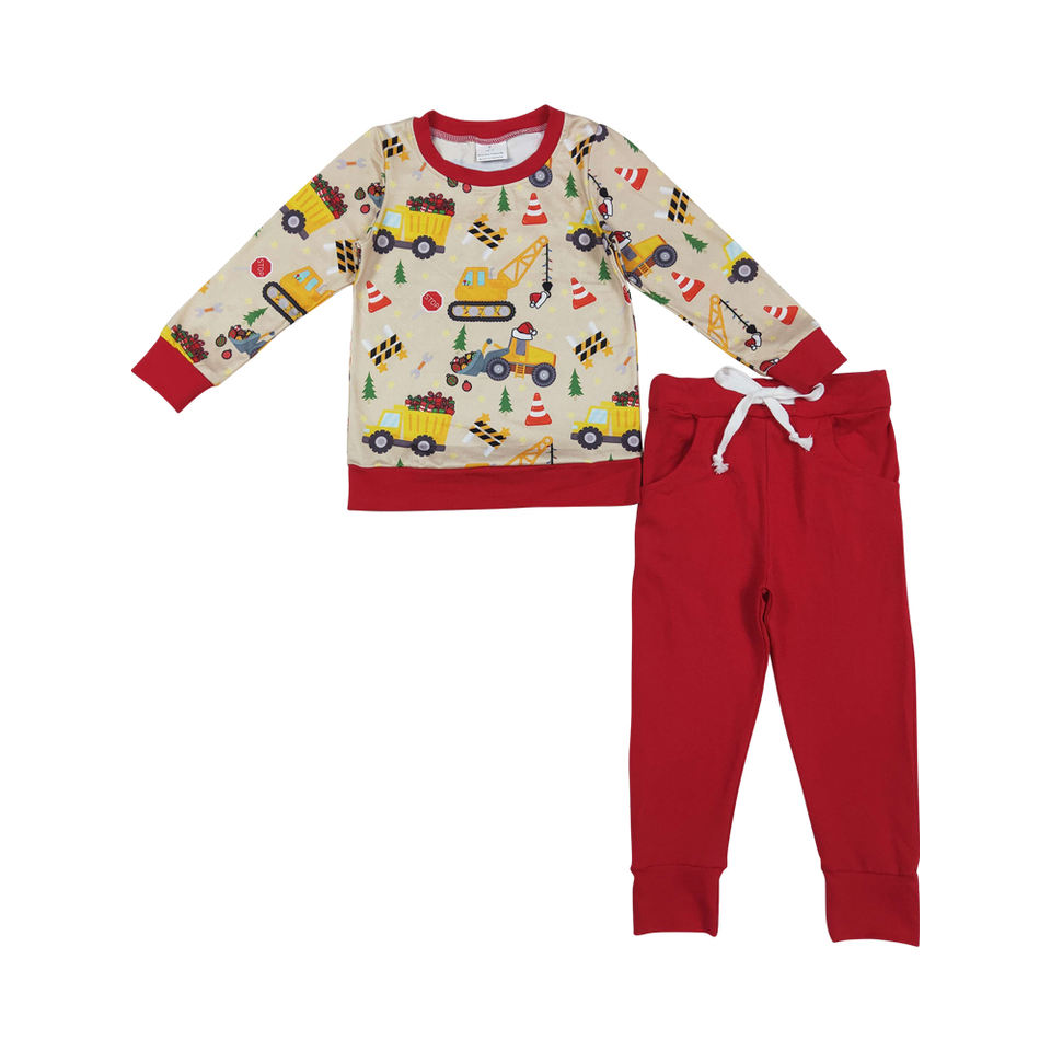 ชุดเด็กผู้ชายสำหรับคริสต์มาสพร้อมส่งขายส่ง เสื้อแขนยาวสีแดงลายรถบรรทุก กางเกงลายรถก่อสร้าง ผ้าไหมนม ตัวอย่างสินค้า 7 วัน